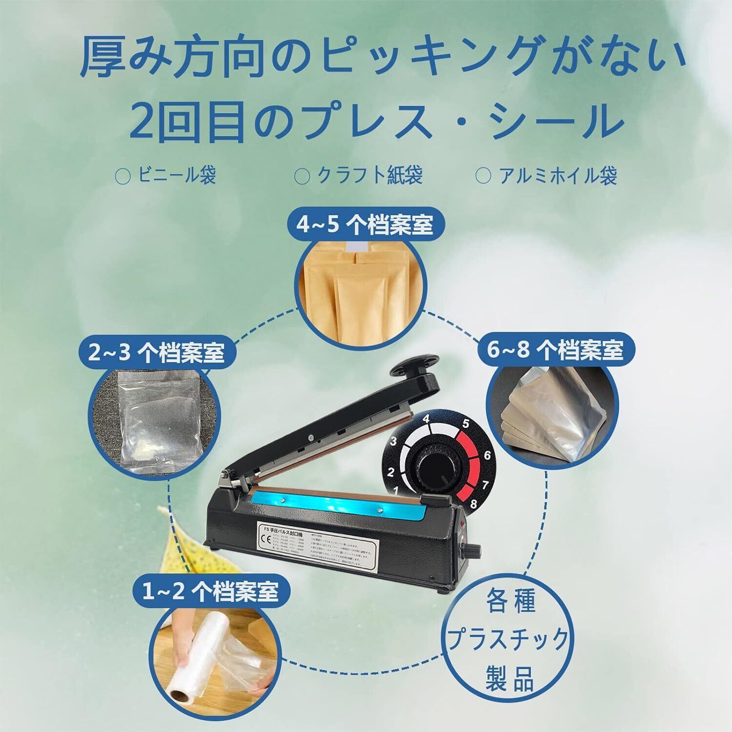 【予熱不要 8段階調整】インパルス シーラー予熱が不要で、電源を差し込んだ直後に使用できます。 8段階調整ツマミで加熱時間を調整、バッグの素材や厚さに応じて、異なる温度を選択してください。使用するたびに、低温から高温までゆっくりと温度を調整するように注意してください、温度を直接最高に調整しないでください。そうしないと、過熱により機械が容易に臭いを発します。