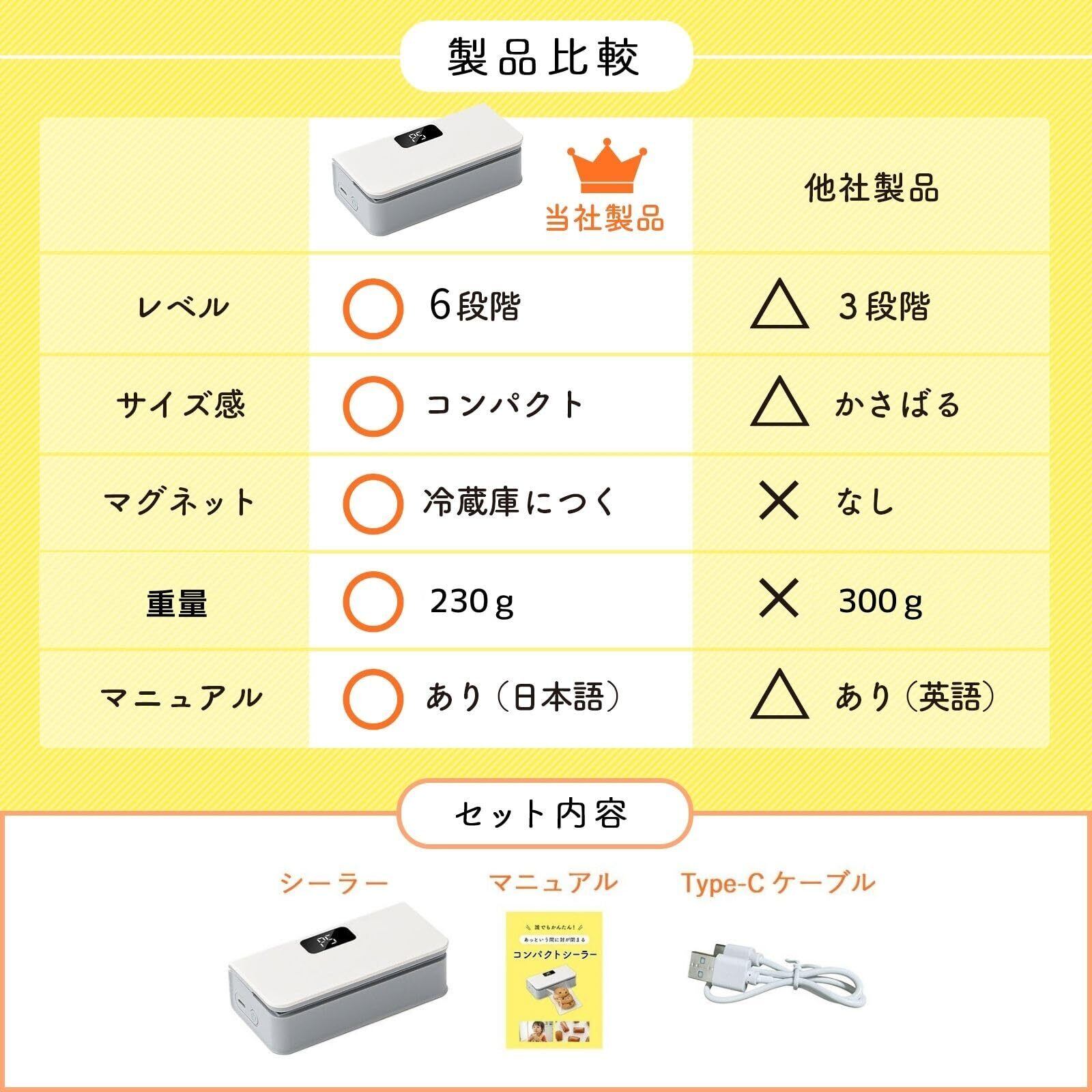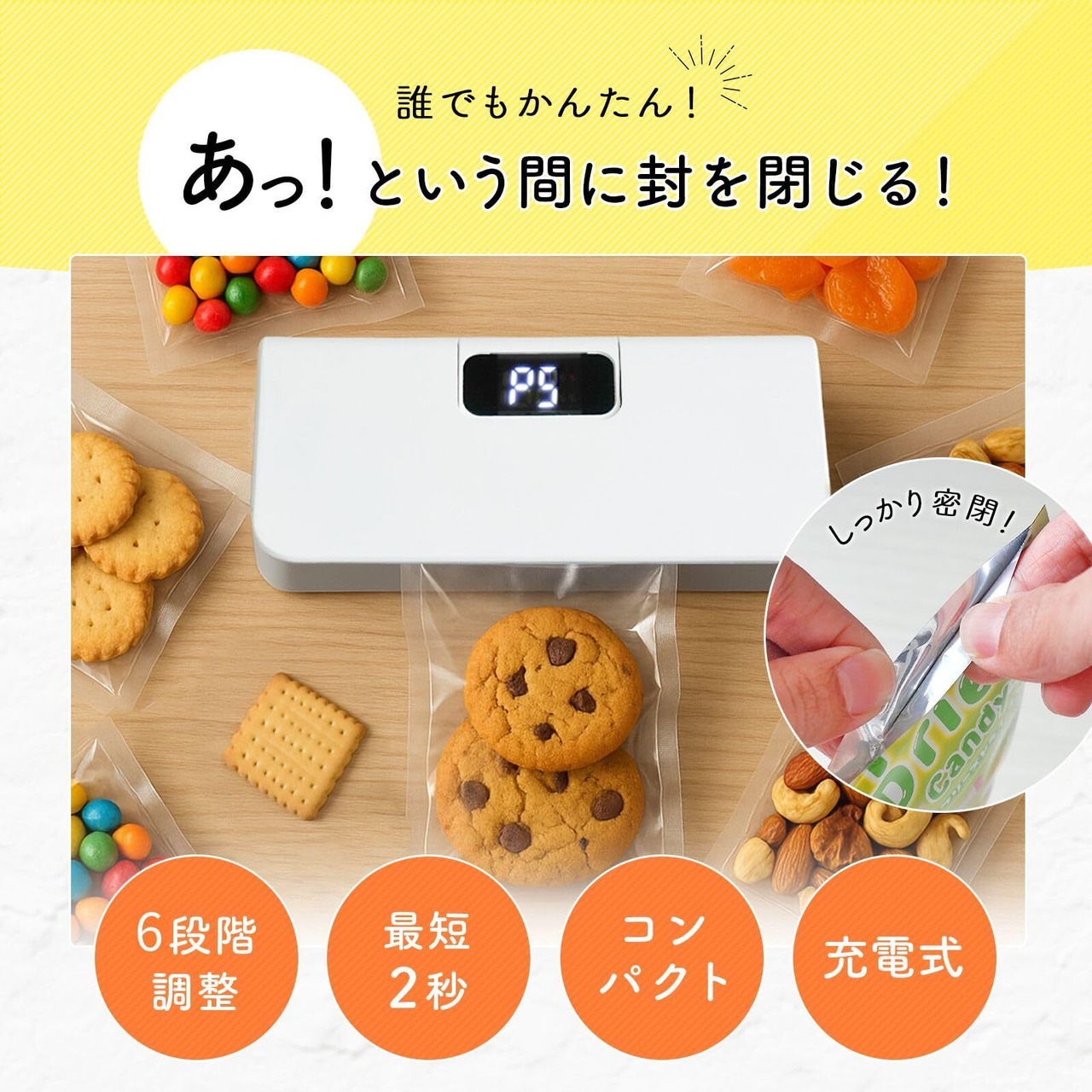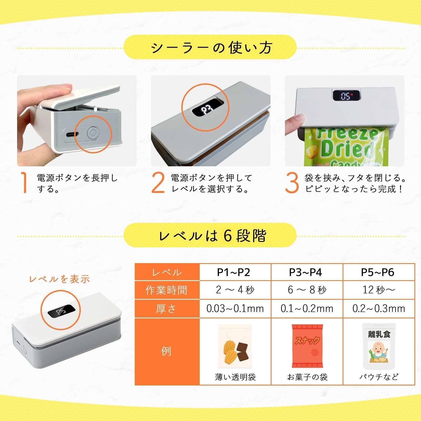 ハンディシーラー シーラー 家庭用 ヒートシーラー フードシーラー コンパクトシーラー USB充電式 6段階 ラッピング スナック お菓子 袋閉じ 小分け 食べかけ 食材新鮮保存密封