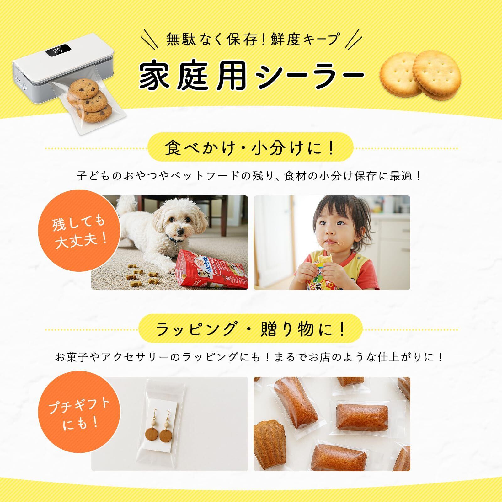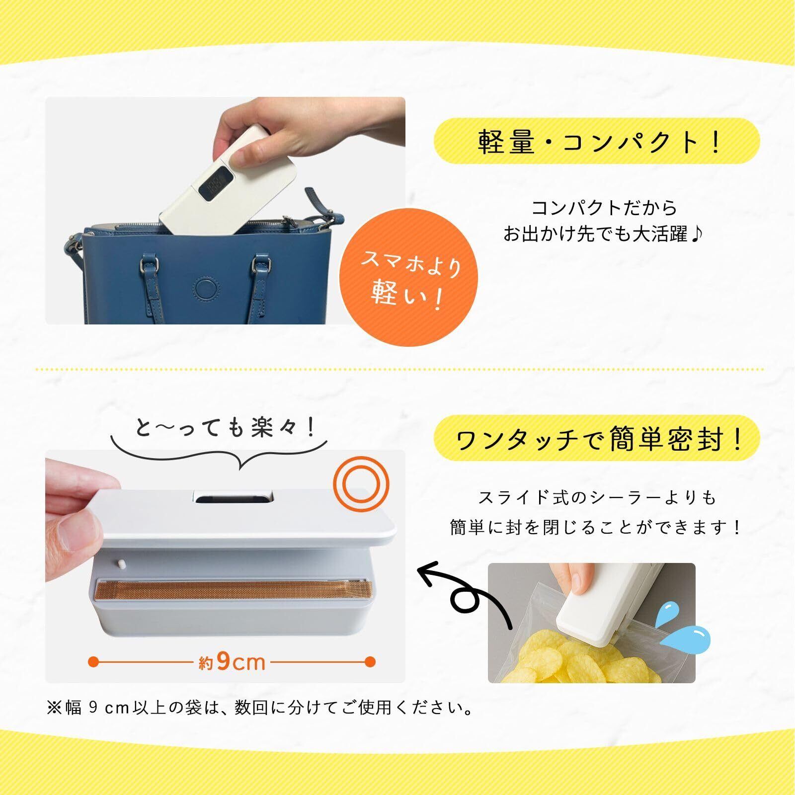 食べかけのお菓・スナックの保存に!9.5センチ幅の袋であれば、1回でラクラク閉じれます!