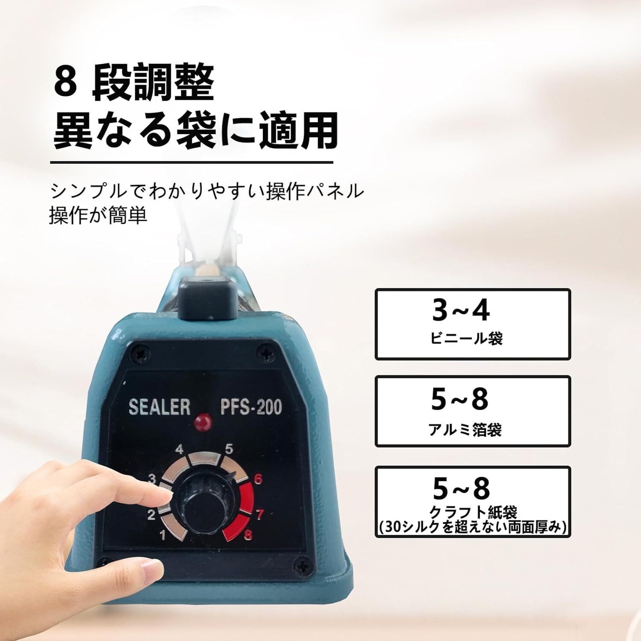【8調整可能なギア】温度は自由にあなたの好みに合わせて、推奨レベル、ビニール袋:1〜3レベル、クラフト紙袋:4〜5レベル、アルミ箔袋:6〜8レベル、高温シーリング、簡単でトラブルフリー。袋によってシール時間が異なりますので、袋の実際の状況に応じて調整してください。温度が高すぎると袋が溶けてしまい、温度が低すぎるとシールできなくなります。 (必ず専用の密封袋を使用して密封してください)