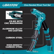 【人間工学に基づいたデザイン】人間工学に基づいた厚くなったTPRカバーハンドルは、より快適なホールドを提供し、より高いてこ比は、リベッターをより省力化します。安全ための留め具により、保管と持ち運びが簡単です。