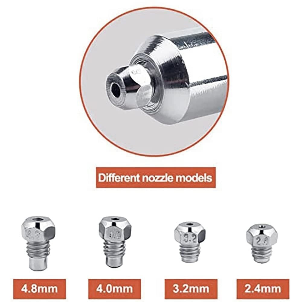 ツールキットの内容: リベットガンアダプター 1 個。 レンチ1本。 ハンドルグリップ1個。 4つのノズルは2.4mm-3/32インチ、3.2mm-1/8インチ、4.0mm-5/32インチ、4.8mm-3/16インチで、さまざまなサイズのリベットに適用できます。