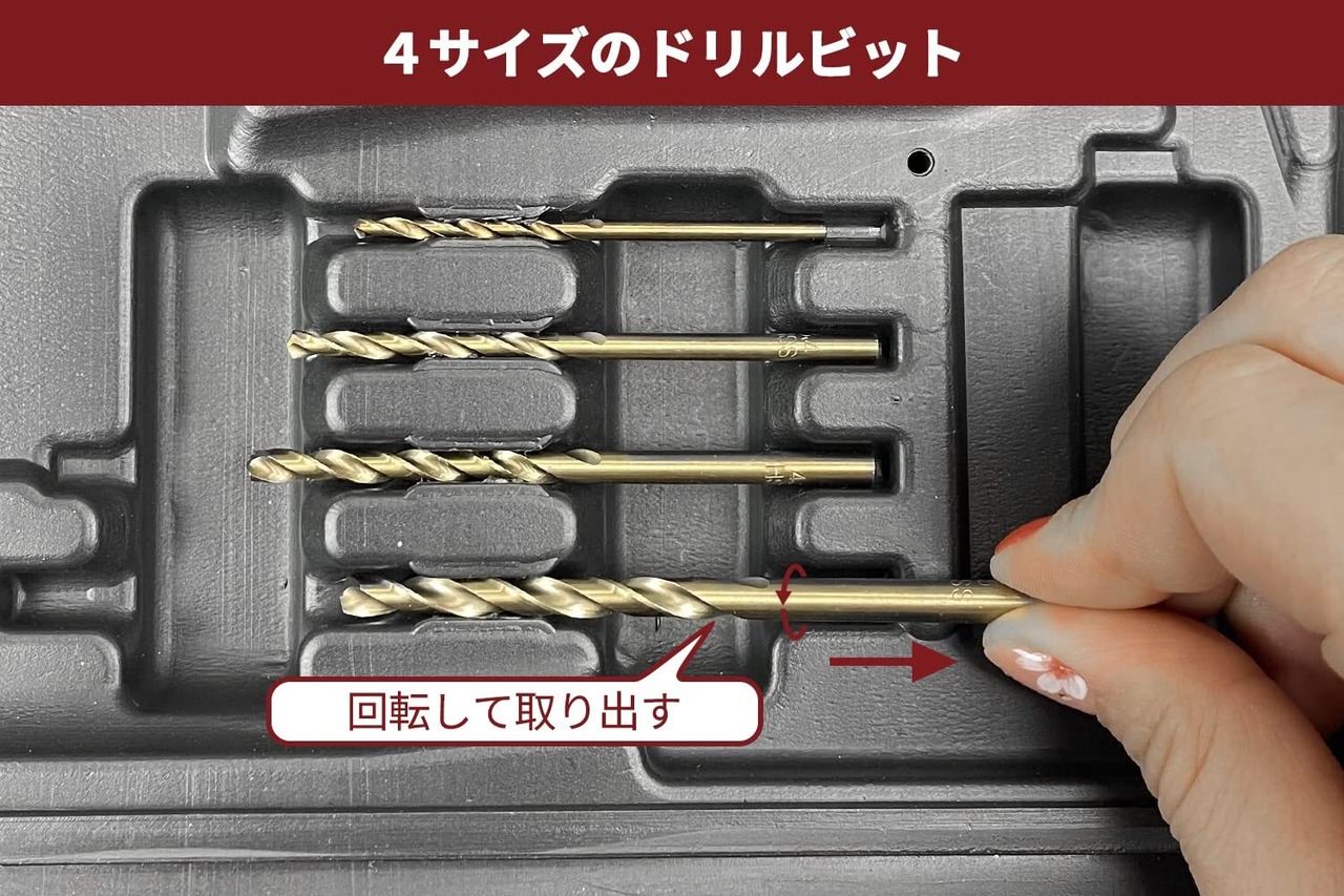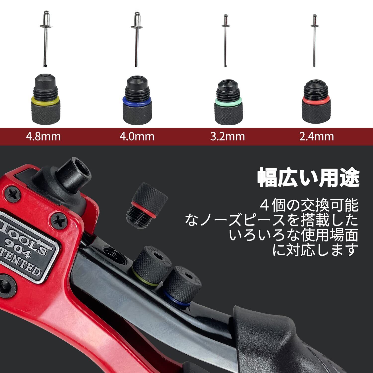 【セット内容】ハンドリベッター本体1個、ノーズピース(2.4mm、3.2mm、4.0mm、4.8mm用)各1個、リベット(2.4mm、3.2mm、4.0mm、4.8mm)各50本、ドリルビット(2.5mm、3.5mm、4.2mm、5.0mm)各1個