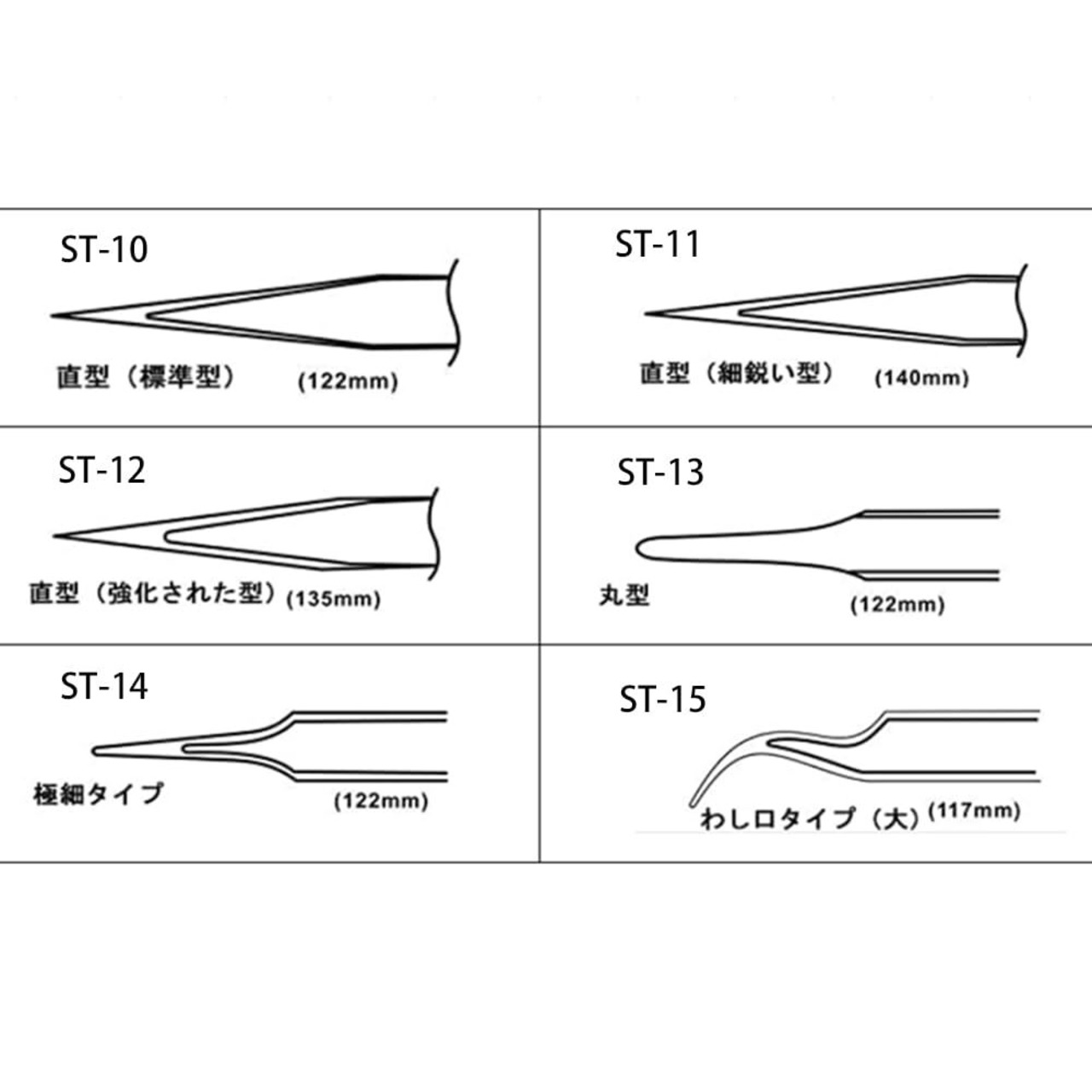ピンセット[ST-15]:先曲タイプ、狭い場所での作業に使える(124mm/4.88in)。