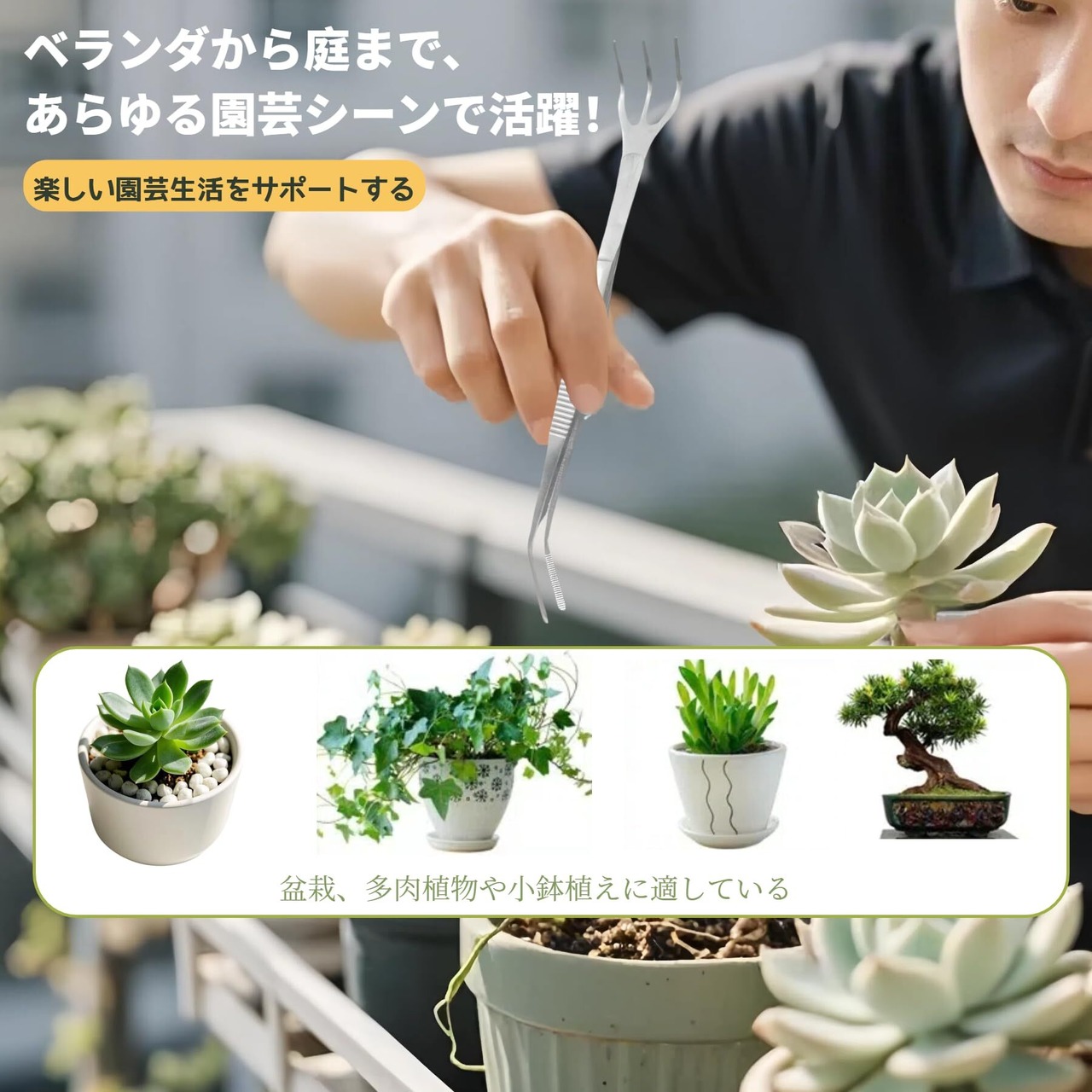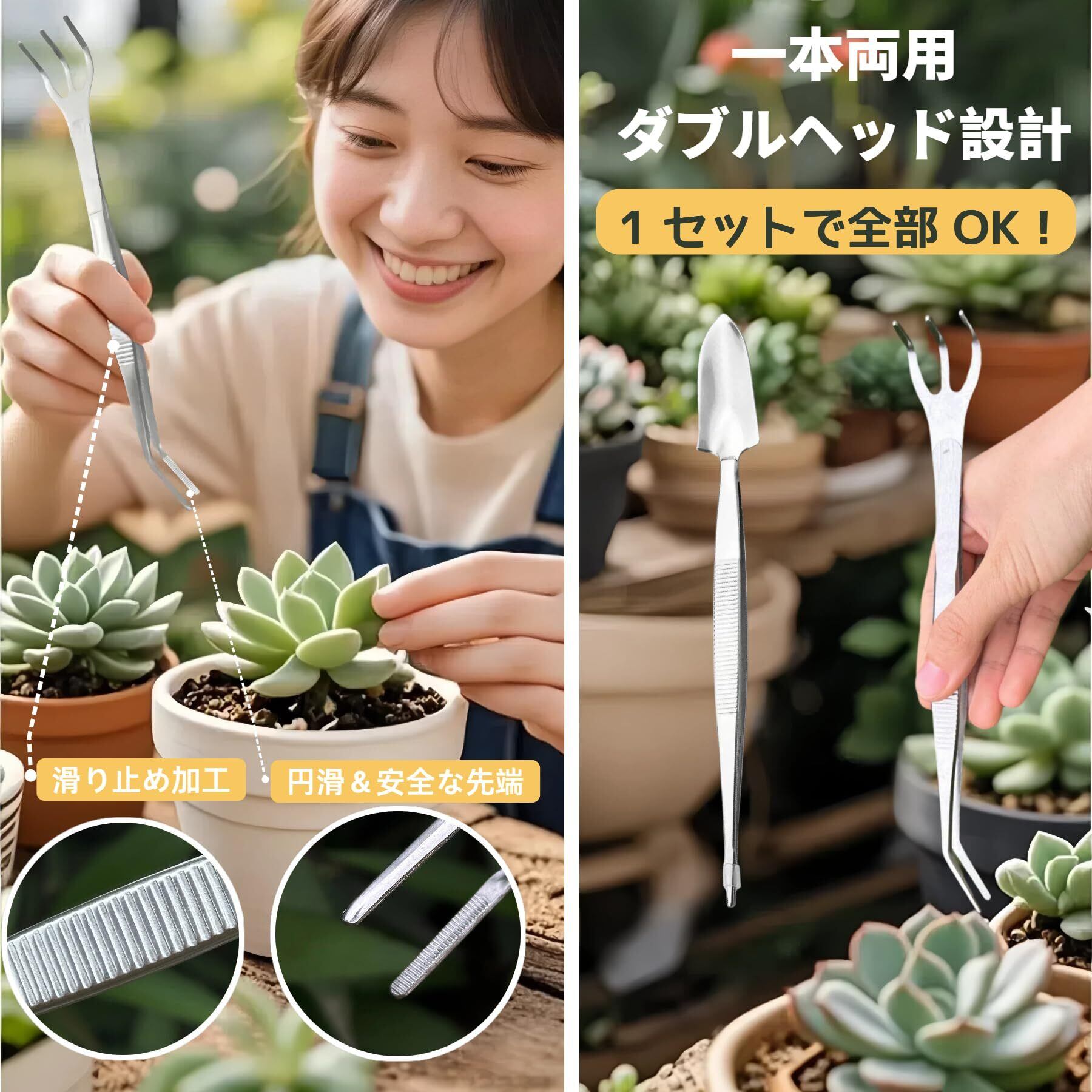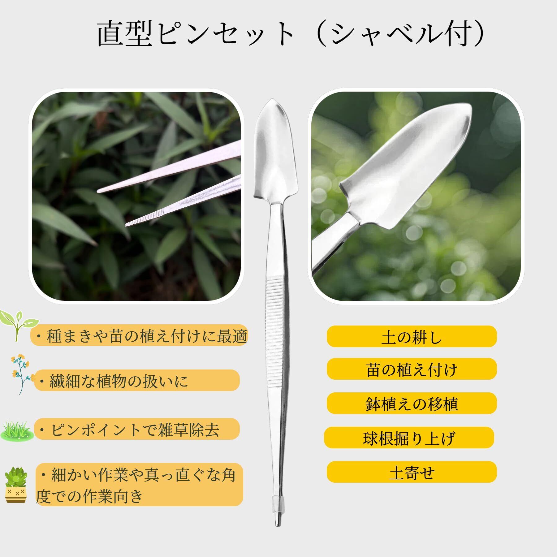 【多機能で幅広い用途対応】ピンセット部分では枯葉・雑草取り・虫取り・間引き用に最適です。シャベル部分では掘土・施肥・移植時の根回しに活用しています。くまでは耕土や種まき時の土の準備をサポートします。多肉植物や小鉢植えの手入れに必要な作業が 1 セットですべてカバーされます。