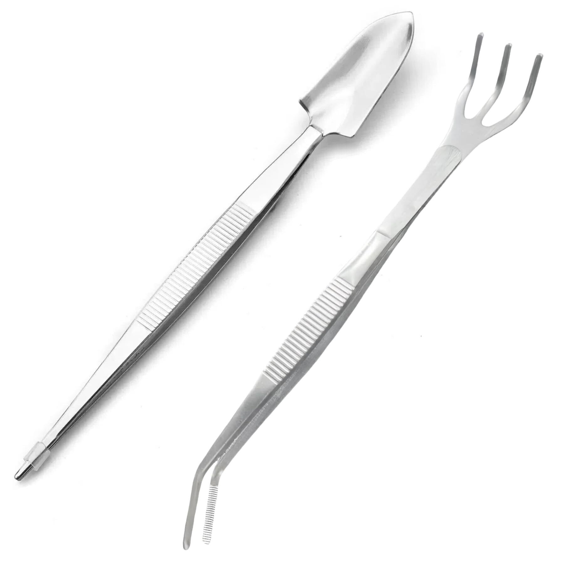 【2025最新】ピンセット 園芸用 ステンレス製 直型・先曲がり スコップ付き 熊手付き 2本セット 滑り止め加工 多肉植物 ツール 盆栽道具 植え替え 雑草取り 間引き用 (シルバー)