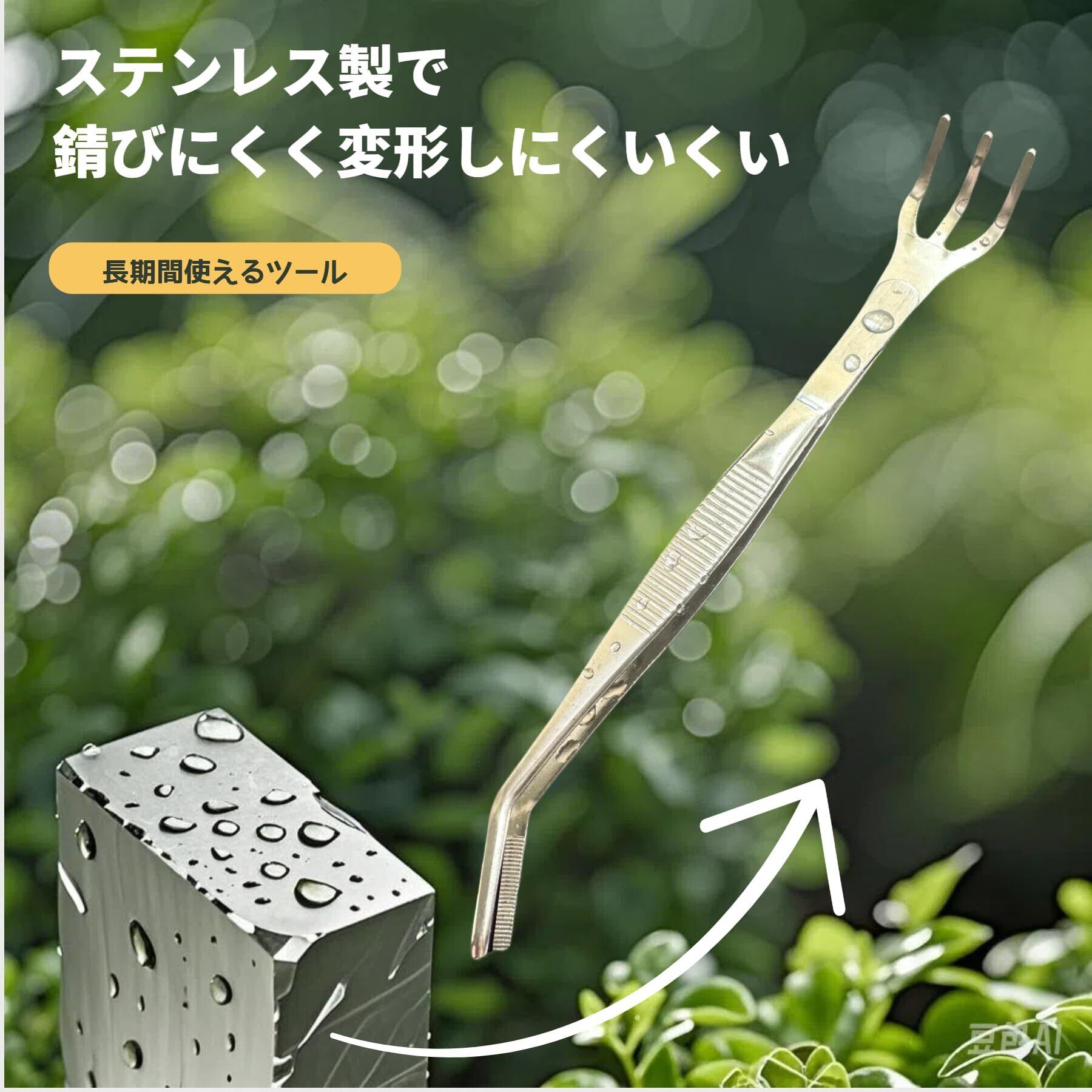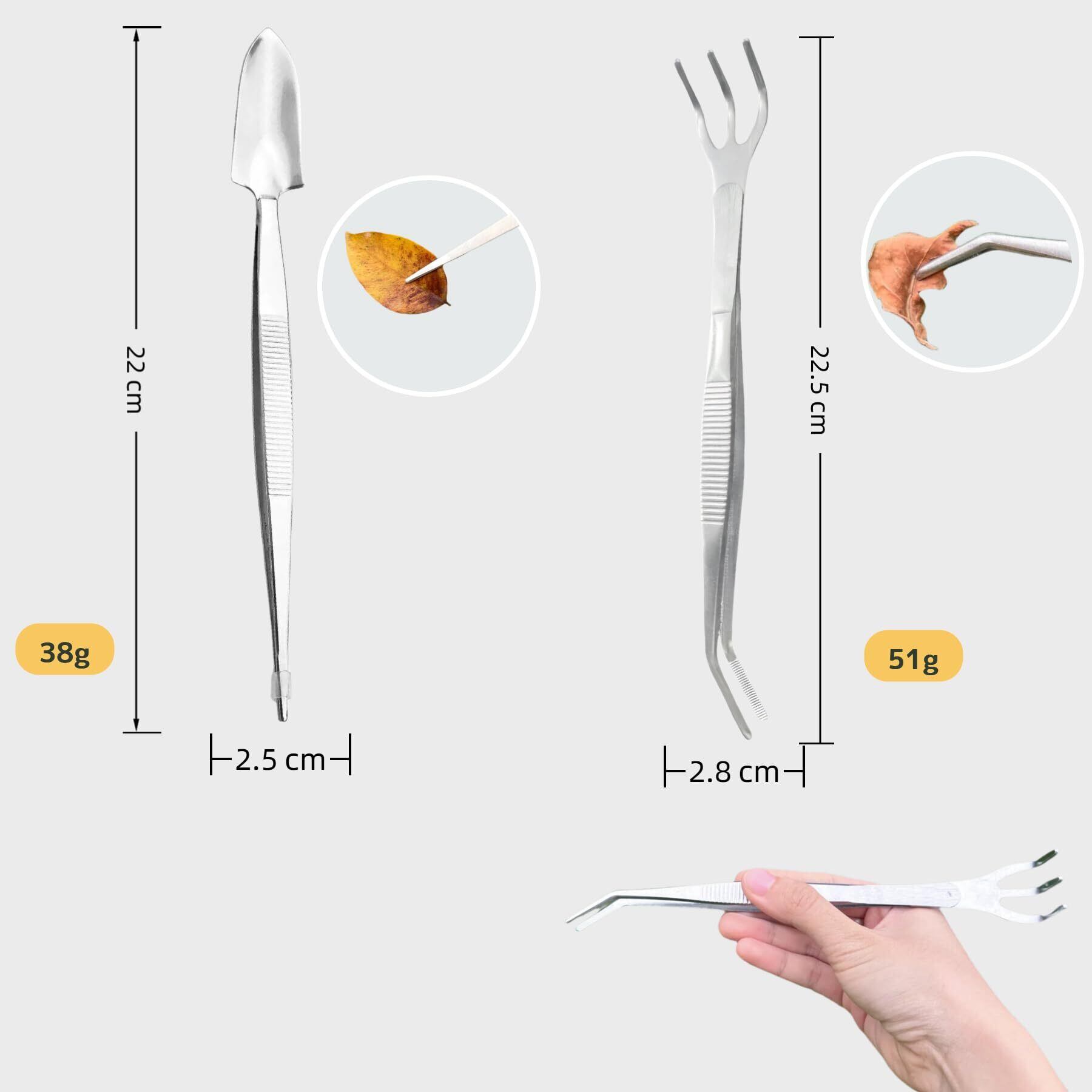 【ダブルヘッド設計で使いやすい】先曲がりピンセット(くまで付)と直型ピンセット(シャベル付)はダブルヘッド設計で一本両用可能です。一体成型なので、部品が外れたり、複数の工具を持ち替えたりする心配がありません。多肉植物の葉や枝、細かな作業も 1 つのツールで簡単に処理できます。