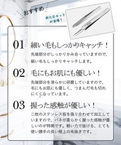 【かみ合わせピッタリ】細かく調整された先端を、手作業で磨き、隙間なくしっかりと咬み合わせ、お肌にやさしい刃先へと仕上がっています。また、お肌にだけではなく、抜く毛にも優しい刃先で、細かなうぶ毛も途中でちぎれることなく、スッと抜くことができます。