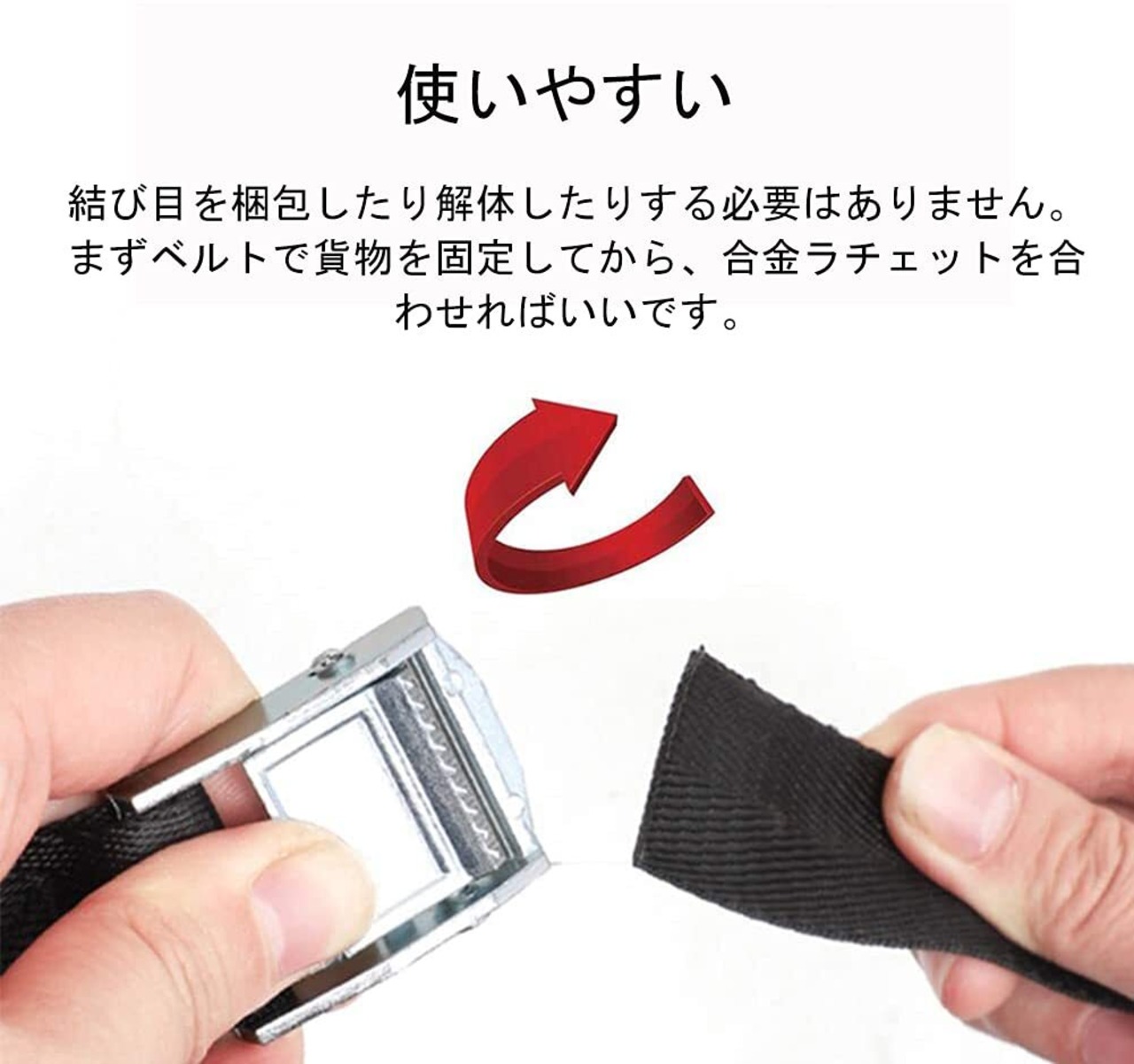 【使いやすい】締め付けの金具部分は亜鉛ダイキャストのため、締め付け強度は十分で,緩まない、プラスチックの物と使い比べて、雲泥の差が出ました。それに、 カムバックル 式のロックで ベルト を通して引っ張るだけで簡単に固定できて、とても便利です。