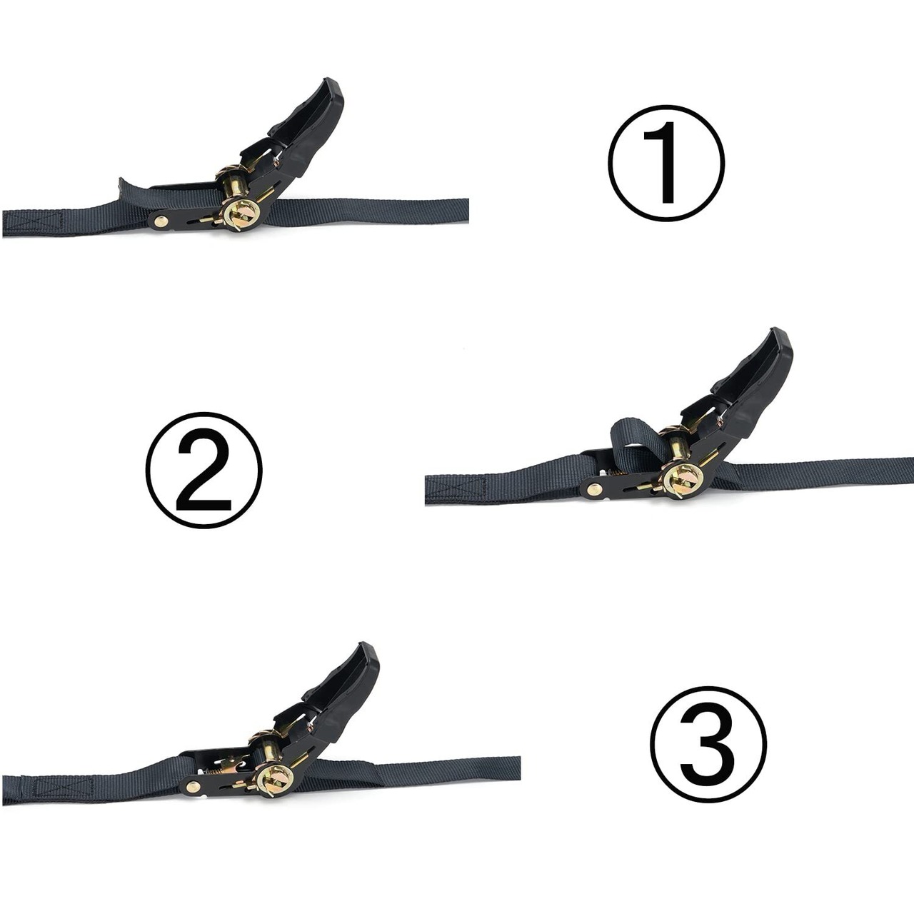 【簡単操作】ベルトの締付け方:ハンドルが水平でない状態で、両手でハンドルを持ち、引っ張ることを缲り返し、開いたり閉じたりすることで、ベルトを巻取ります。ベルトの緩め方:凹んだ黒いゴムの位置を押さえて、グリップを水平に調整して、ベルトを引き出せばいい。