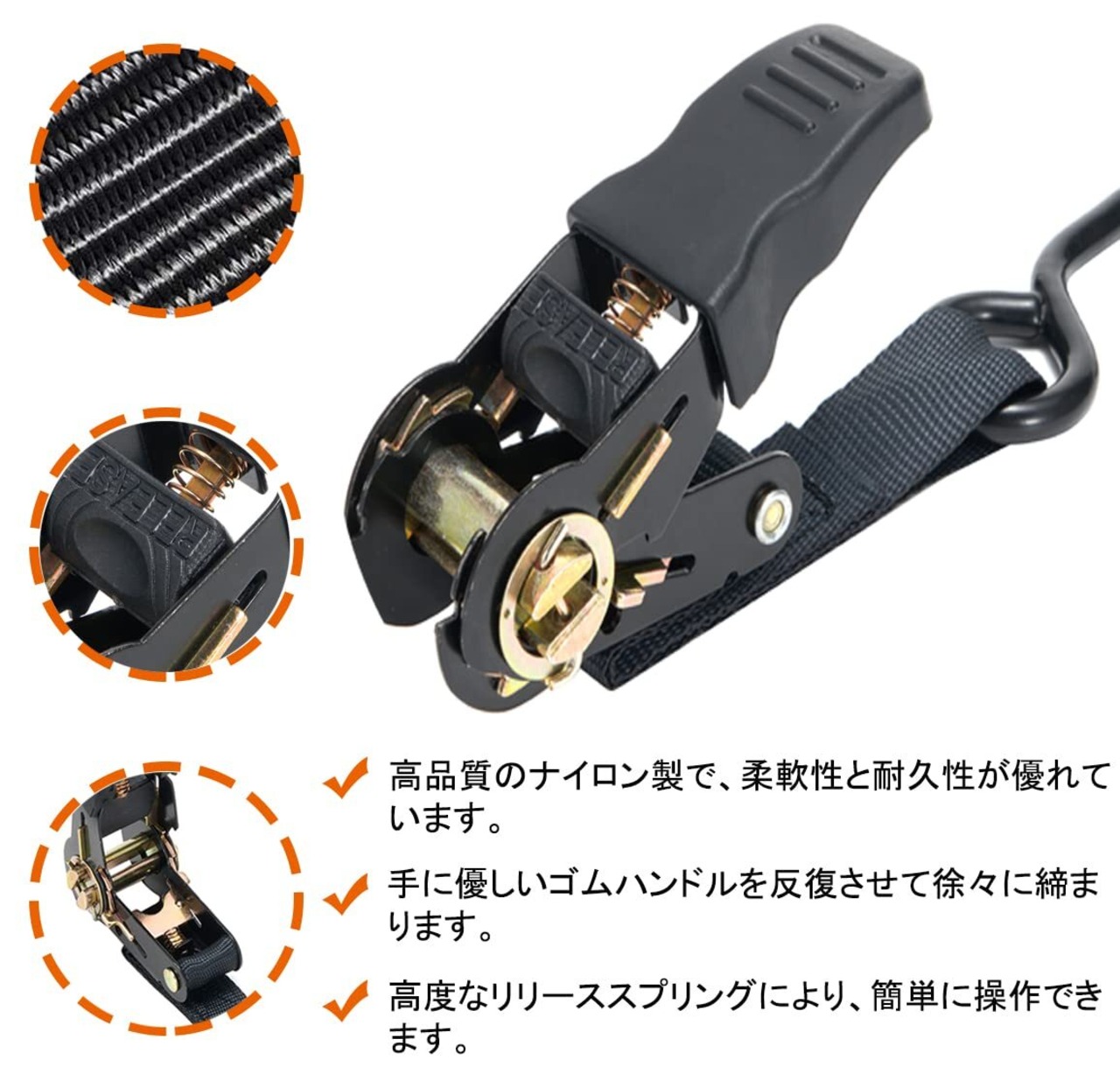 【ラチェットベルト】高品質のナイロン素材を採用して、強度と耐久性は抜群で、ラチェット機能付きで、しっかりと荷物の締め付けが行えます。