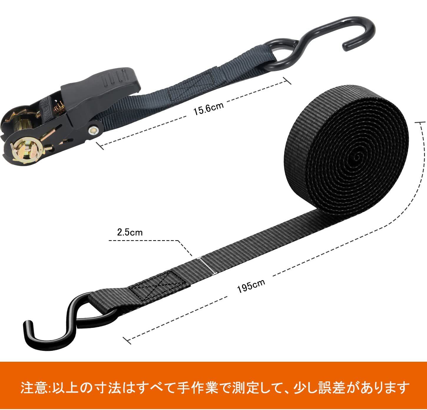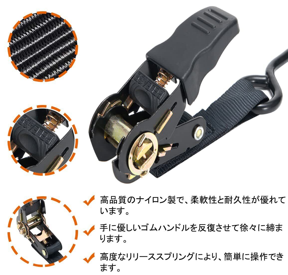 ラチェットベルト タイダウンベルト 2m 幅2.5cm 4本セット 荷締めベルト 破断荷重800kg/本 最大使用荷重225kg ラッシンググベルト タイダウン 引越し 運搬用 ナイロン オートバイ対応 ブラック