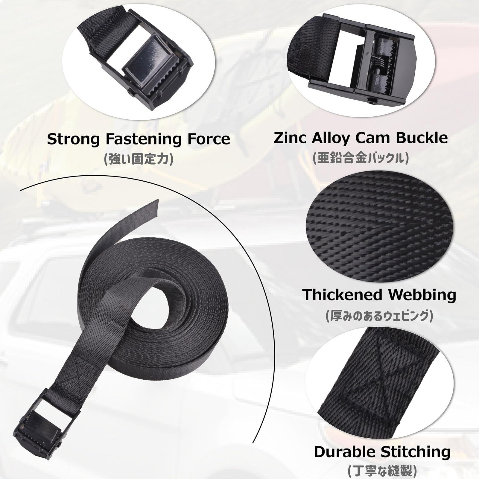 【材質】荷締めベルトは強化したポリプロピレン素材を採用していて、強度、耐摩耗性に優れています。バックルは電気泳動されたメタル、錆びに強くて耐久です
