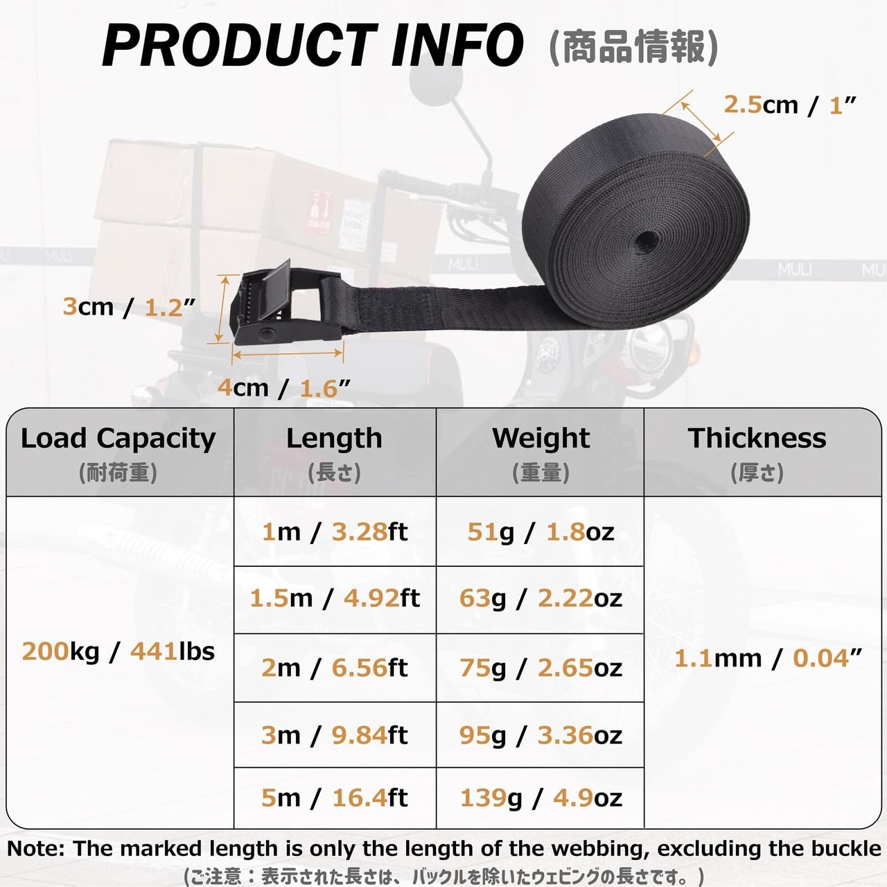 【寸法】ラッシングベルト幅2.5cm;長さ1m、1.5m、2m、3m、5m; 厚み: 1.1mm; 破断荷重: 200kg