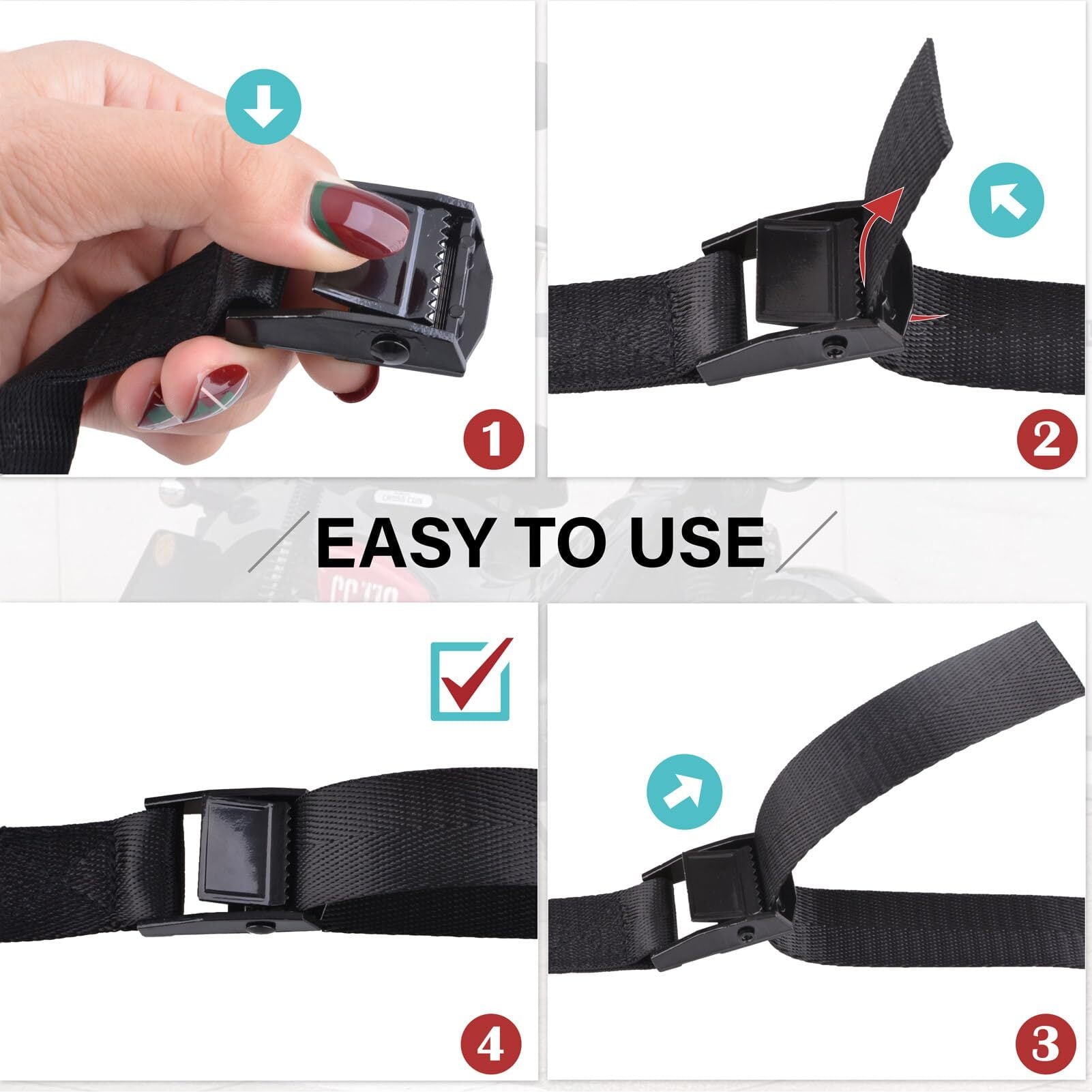 【機能】荷締バンドはカムバックルで調整、ベルトをバックルに通して強く引っ張ると締まる。簡単にしっかり荷物を固定できます