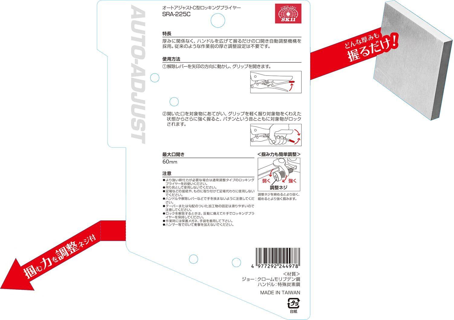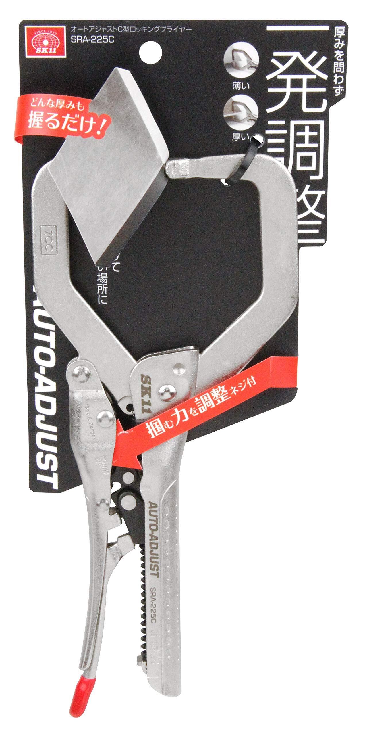 SK11(エスケー11) オートアジャストC型ロッキングプライヤー 最大口開き60mm ふところ深さ61mm 全長228mm SRA-225C