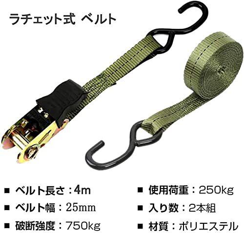 【基本仕様】調節側長さ:4m、固定側長さ:0.2m、幅:2.5cm。 ラチェット機能付きで、しっかりと荷物の締め付けが行えるラチェットベルト2本セット。
