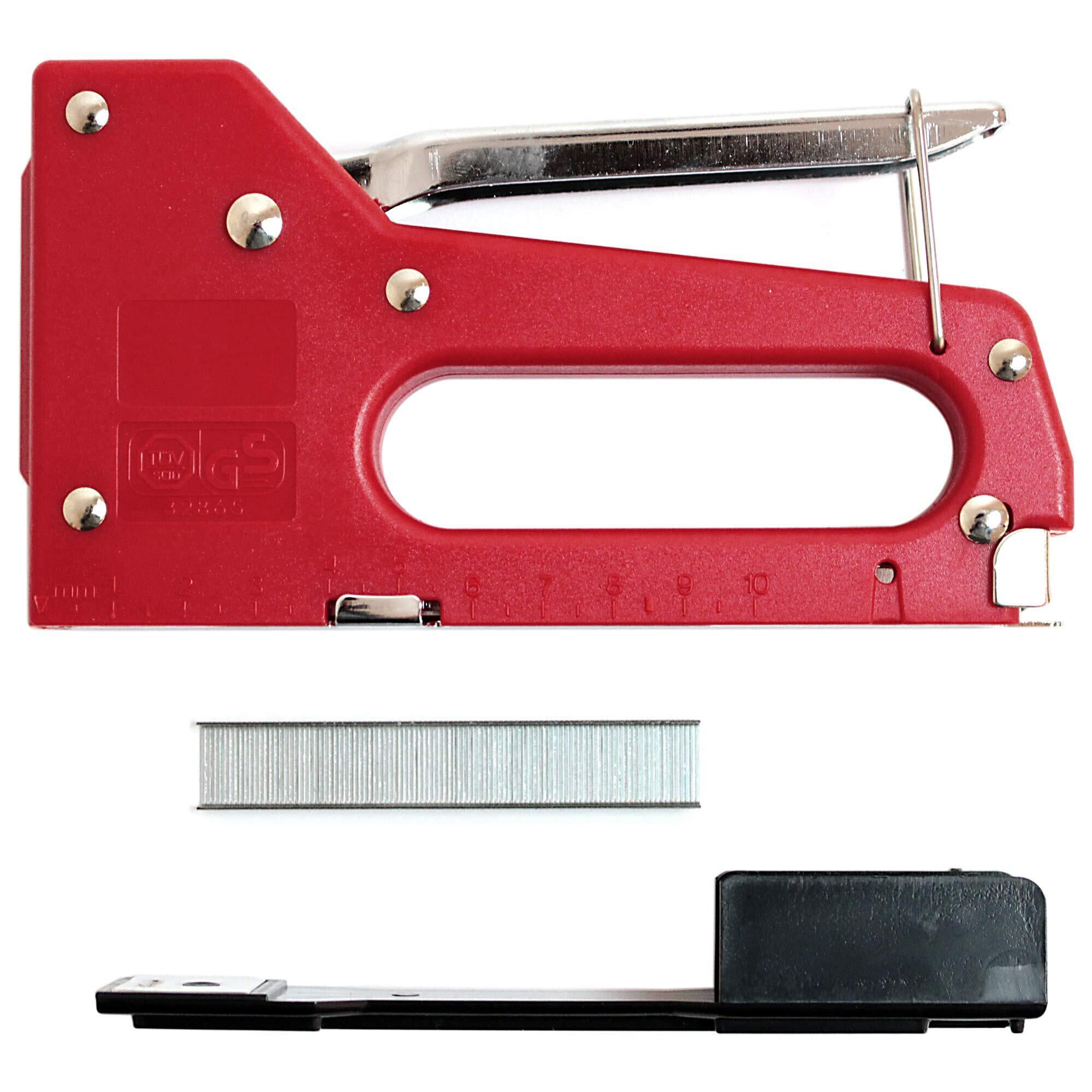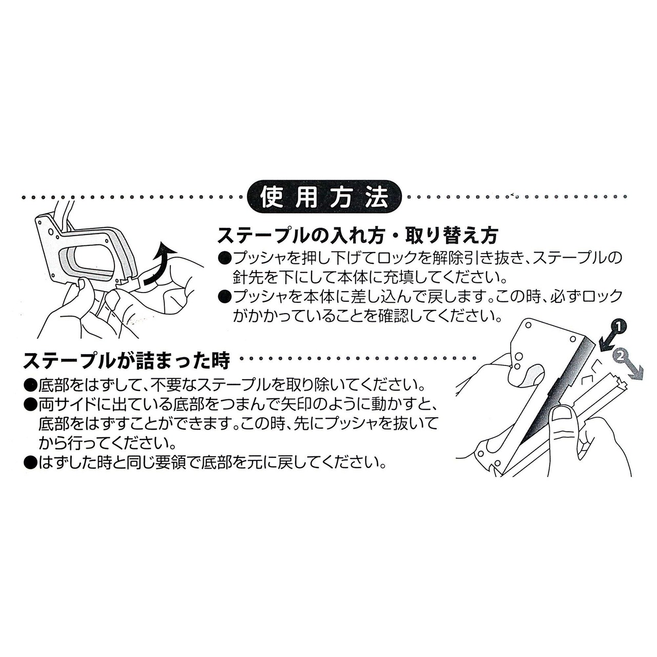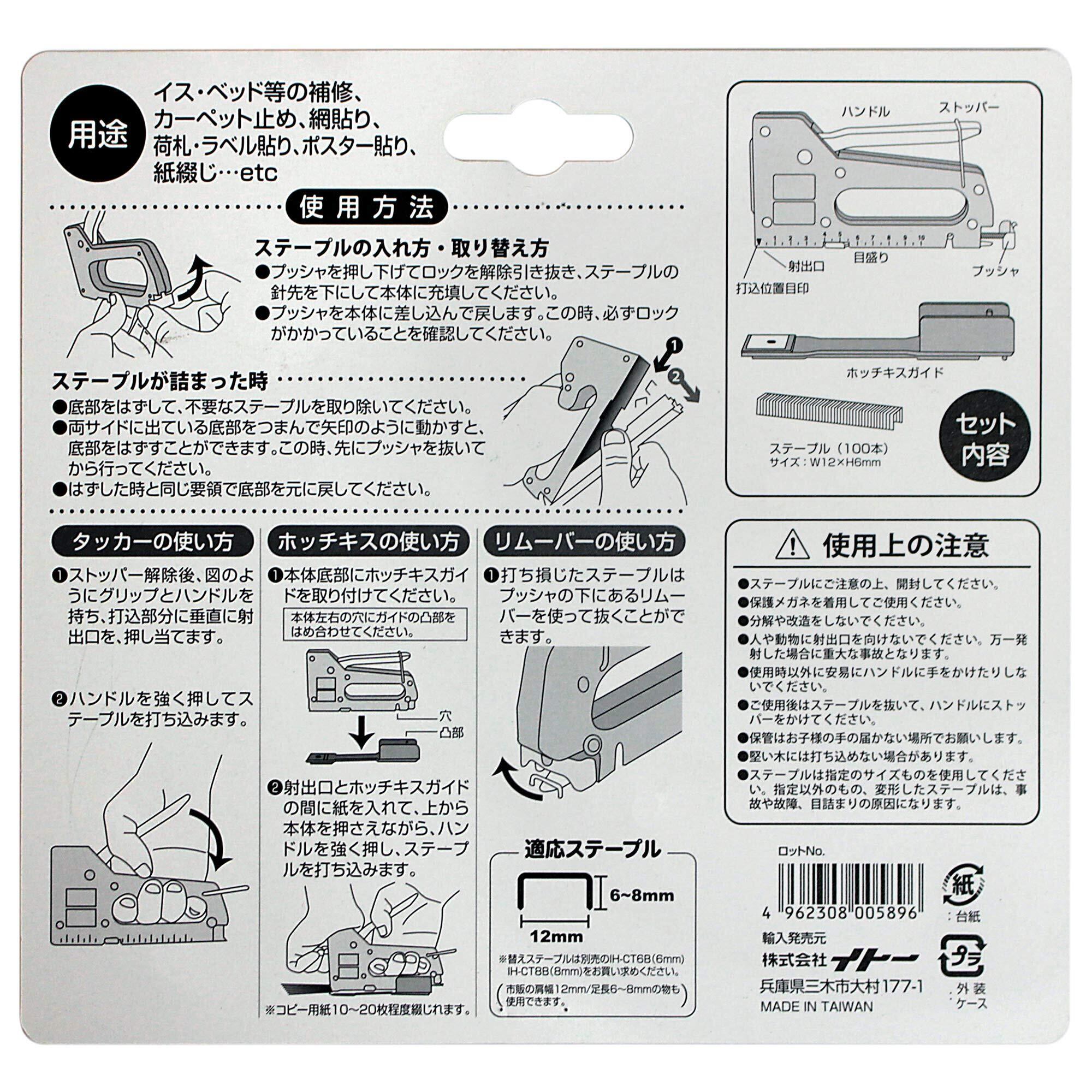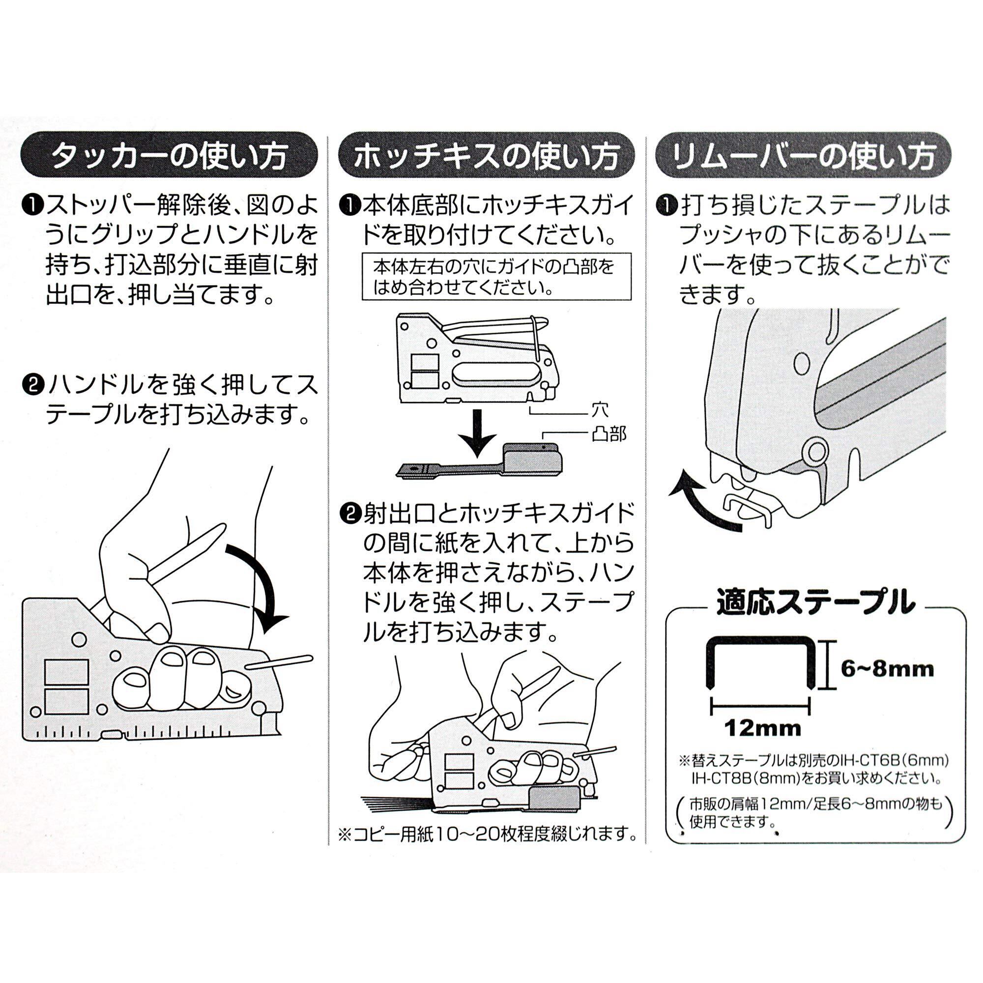 【本体】 品番 : IH-CT1 サイズ : 170×180×26 重さ : 245g 本体材質: ABS ハンドル材質: 金属 替針50本付属(肩幅11.3*足長6mm) ホチキス能力:コピー用紙10~20枚(材質による) 用途 : ベント飾り付け、ポスター貼り付け、椅子のカバーの張替作業、薄合板(棚の背板)等 の貼り付け、紙綴じ作業(ホチキス機能) 【替針】 肩幅12.7㎜ 厚み0.7㎜ 足長 6ミリ / 8㍉ 1本100本連結 MAX社替針互換