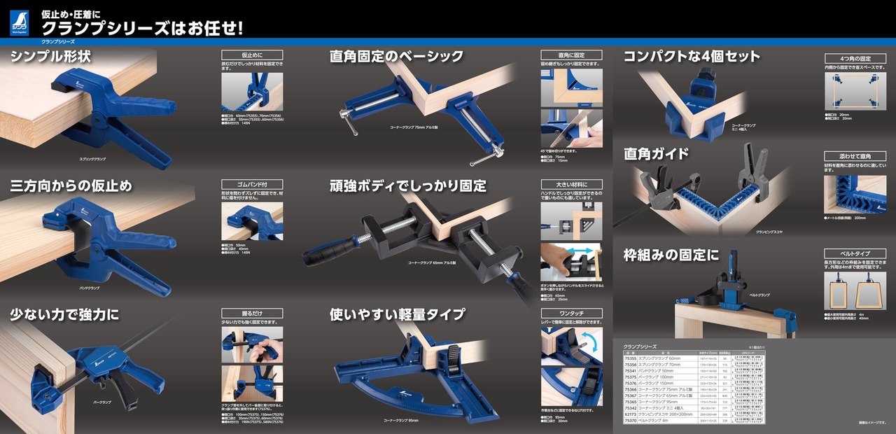 ネジ止めやビス打ちのズレ防止、接着時の仮止めの際にご利用いただくミニサイズのコーナークランプです。