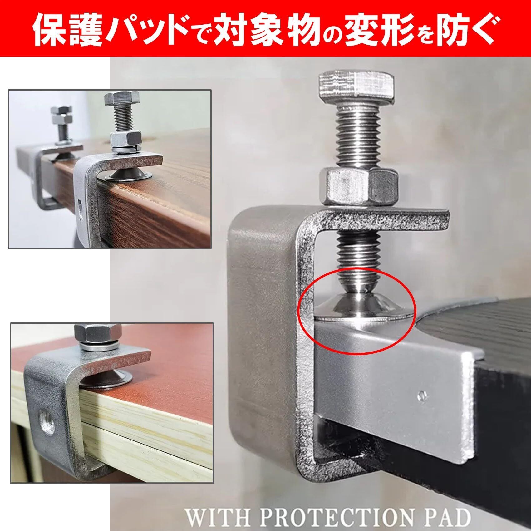 ネジノブ先端には保護パッドを装備しており、固定時に対象物の変形や傷を防ぎます。