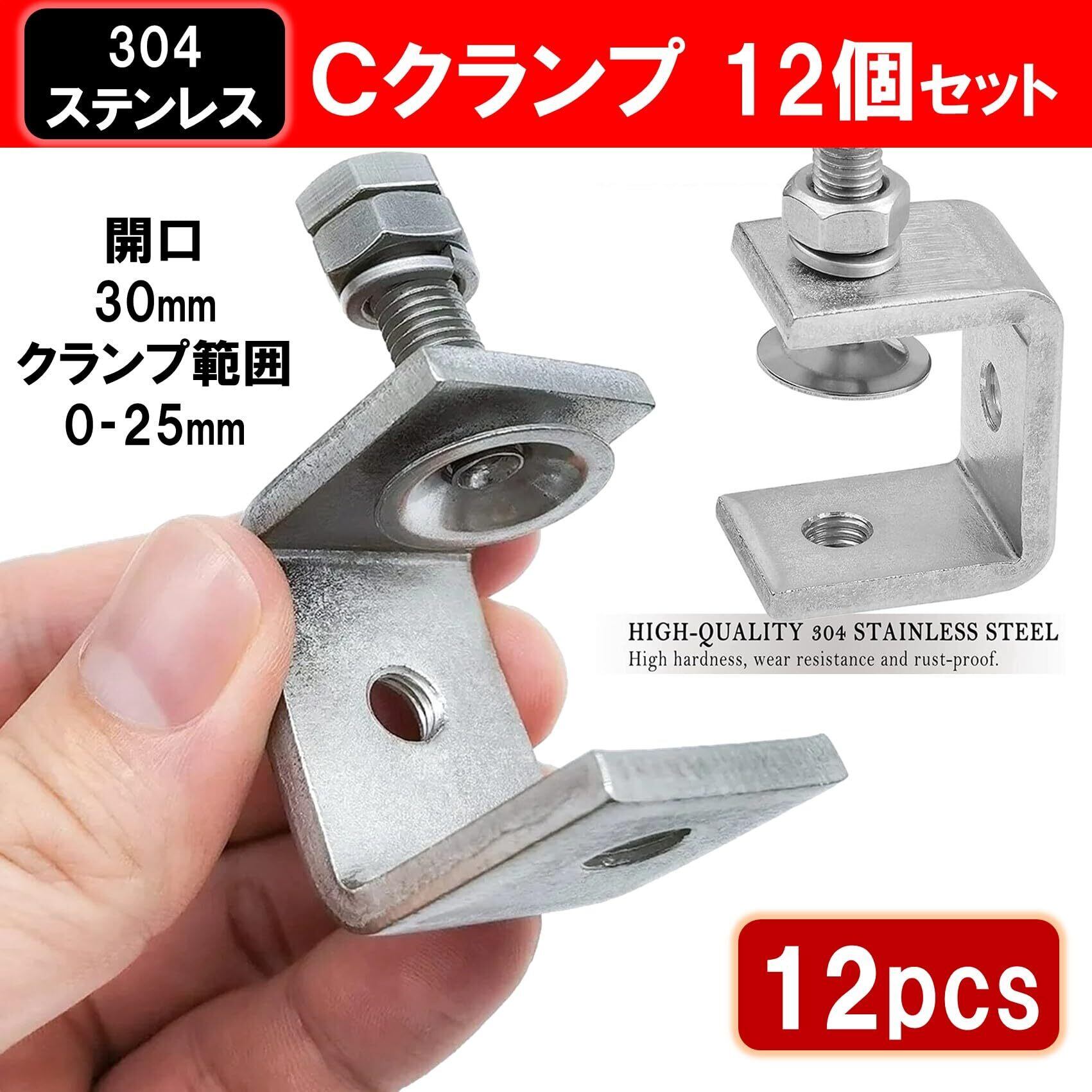 304ステンレス鋼製Cクランプ12個セットです。開口幅30mm、クランプ範囲0-25mm小型軽量ながら対象物をしっかりと固定し機能性と実用性に優れたCクランプです。