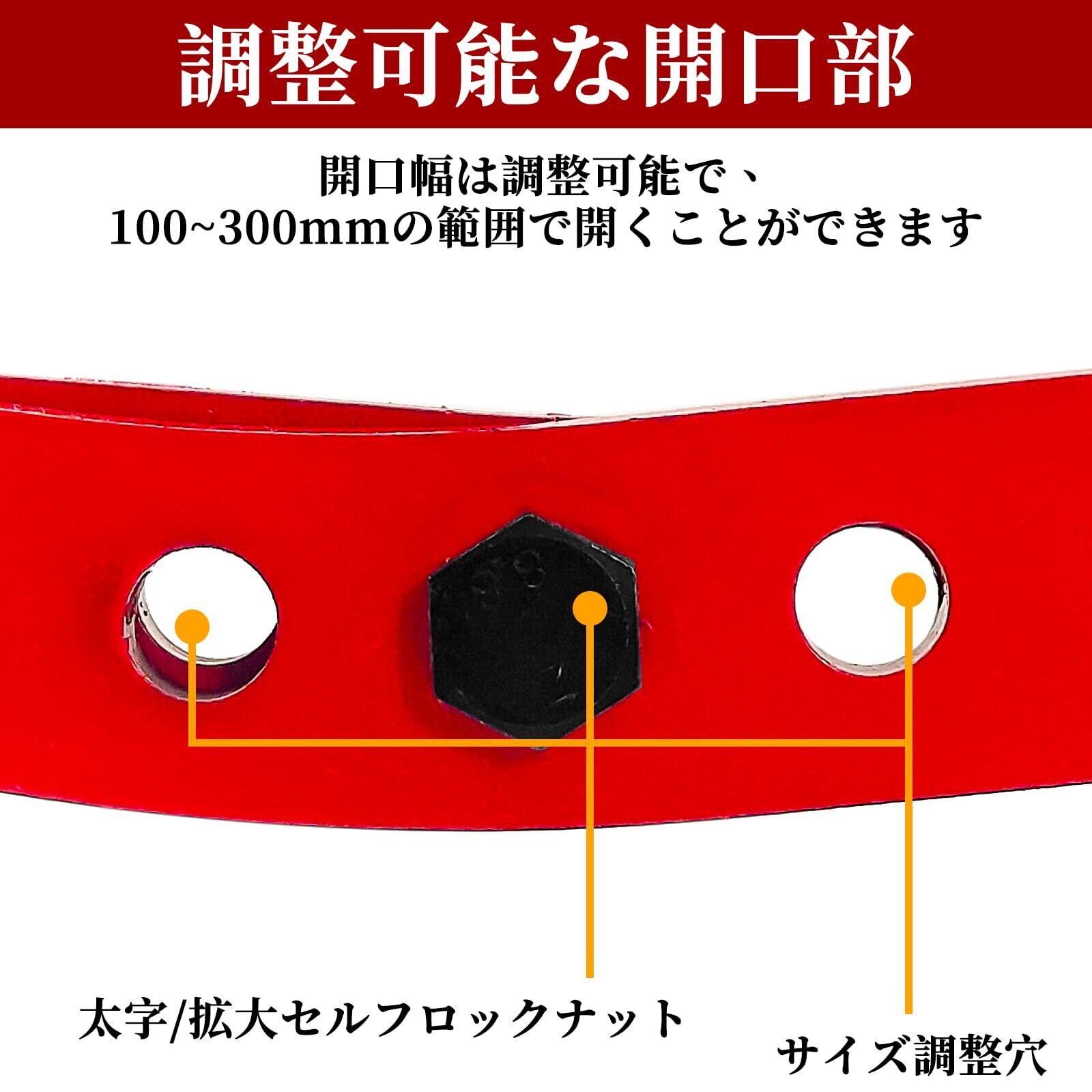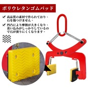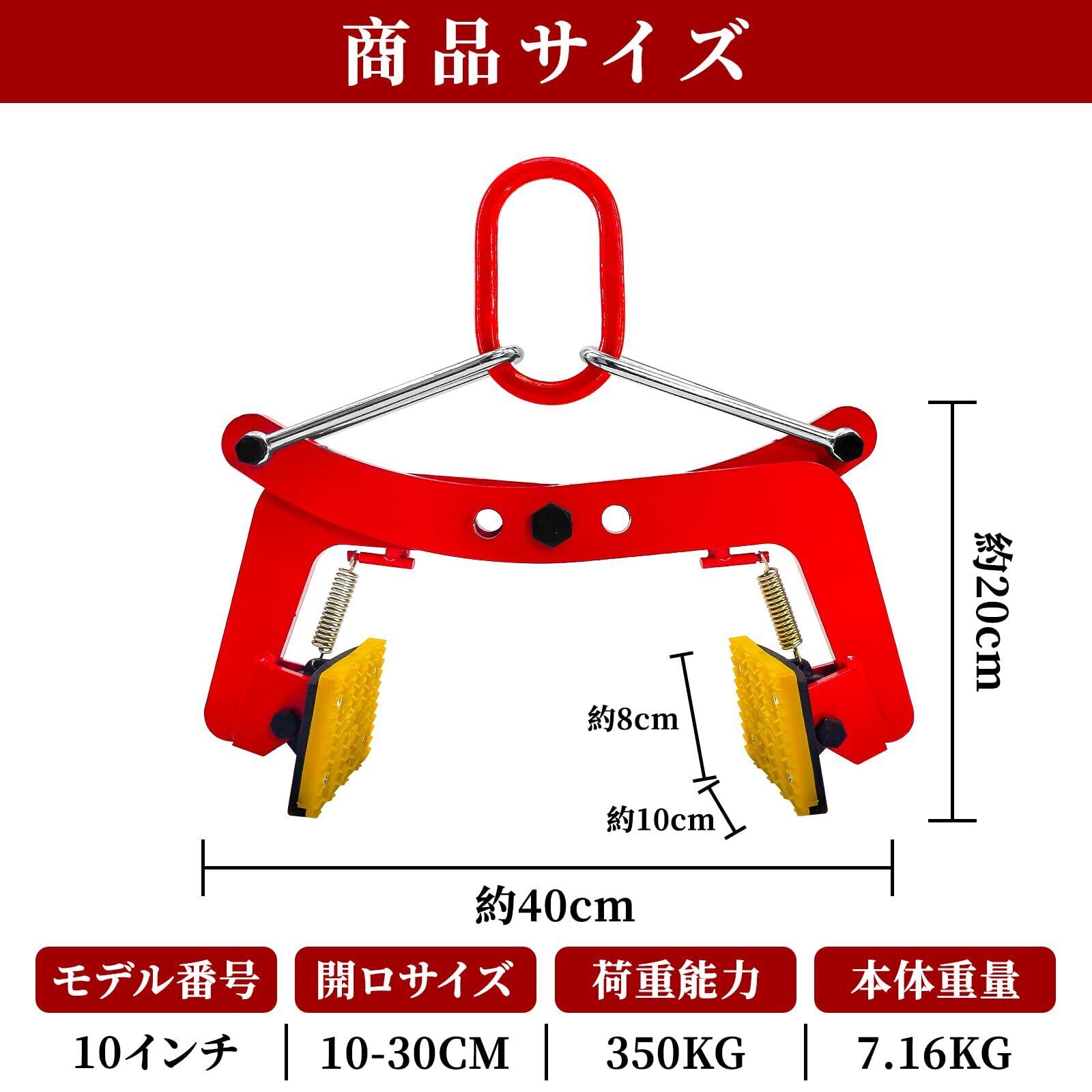 【製品仕様】本体サイズ:約40×20×10cm。本体重量:約7kg。定格荷重:350kg。開口幅:100-300mm。素材:合金鋼、ポリウレタンゴム。カラー:赤。