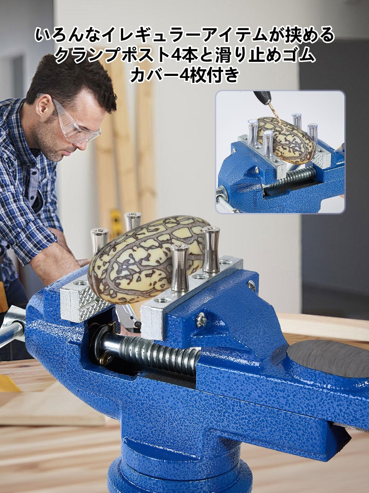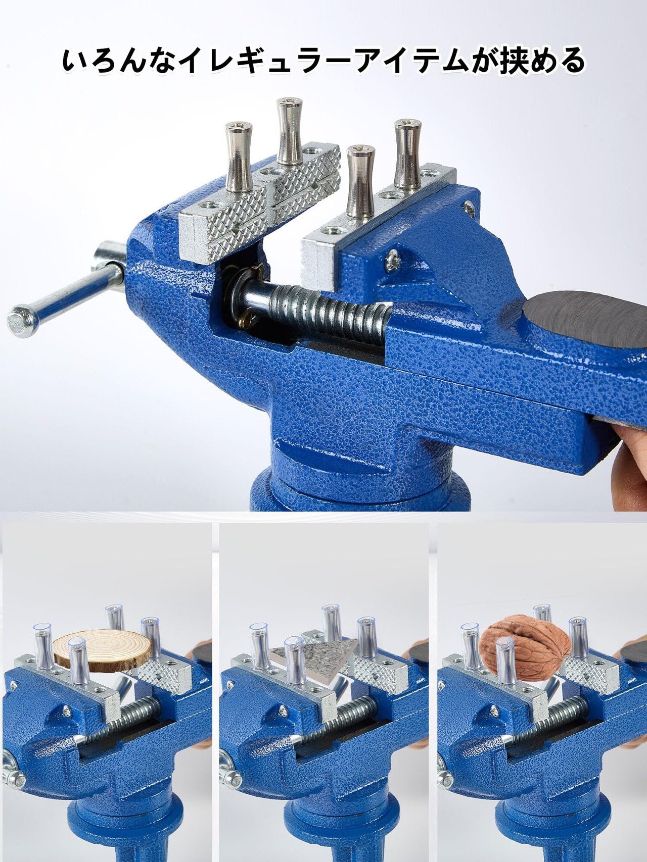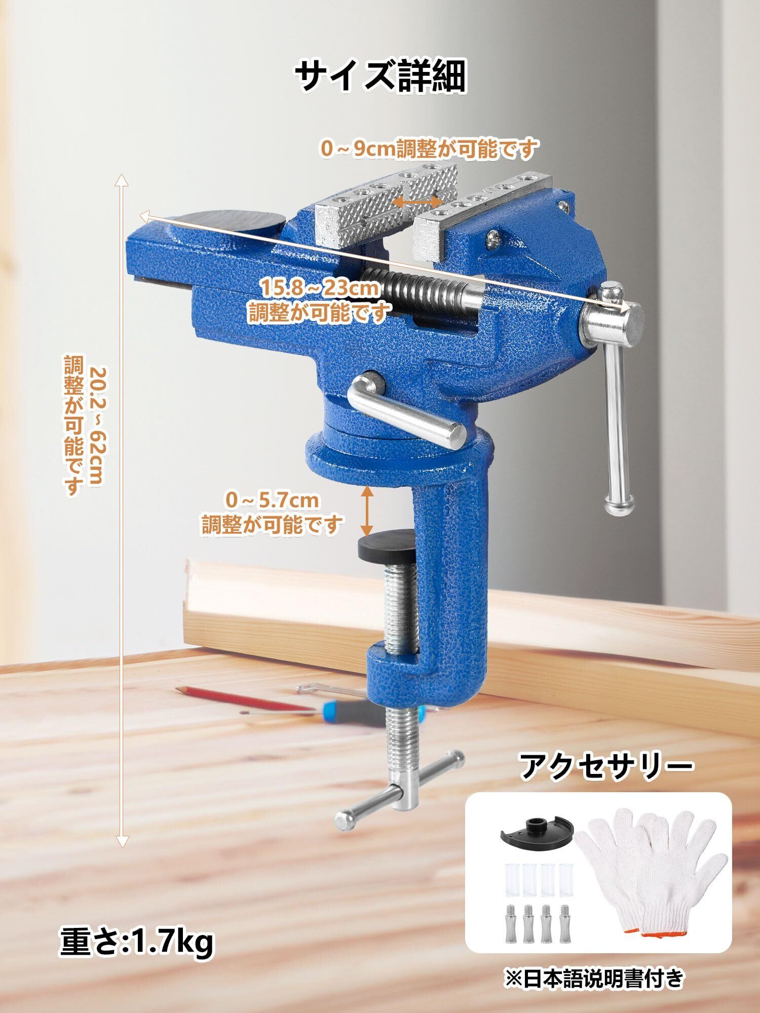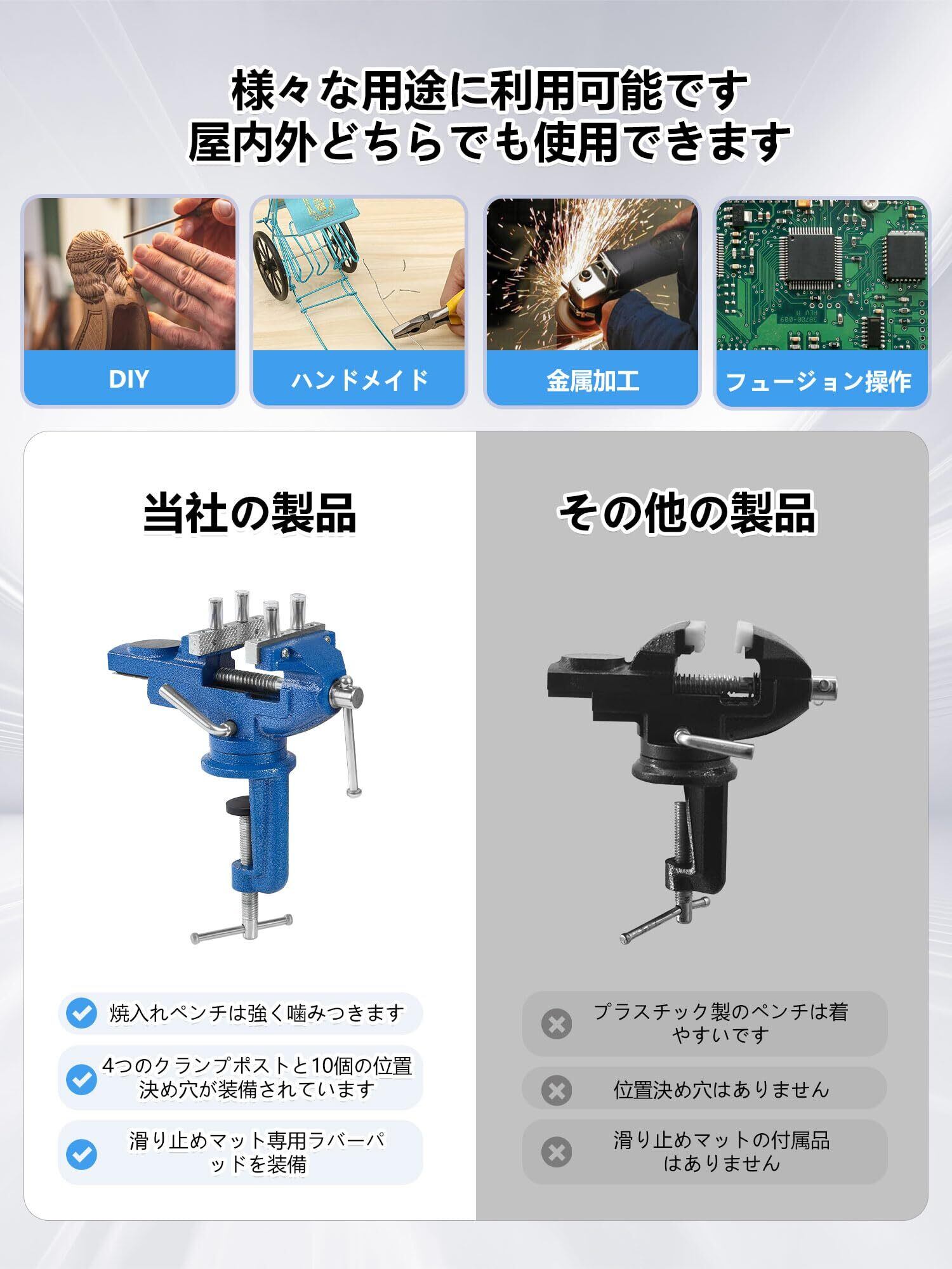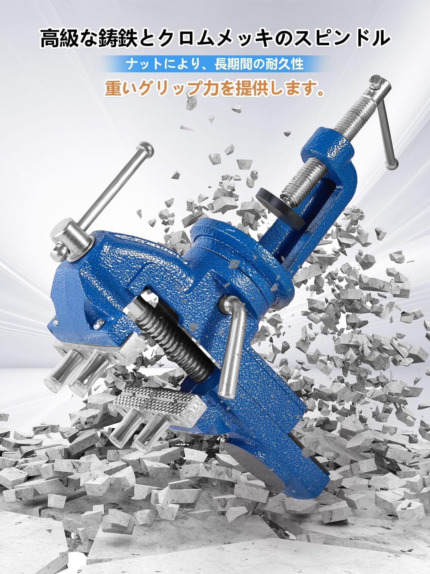 【サイズ詳細】本体重量1.8kg、360°回転盤。クランプの最大開口幅64mm クランプのグリップ力は300kg、【セット内容】青卓上万力*1、手袋x1、滑り止めマットx2、クランプポスト4本と滑り止めゴムカバー4枚付き