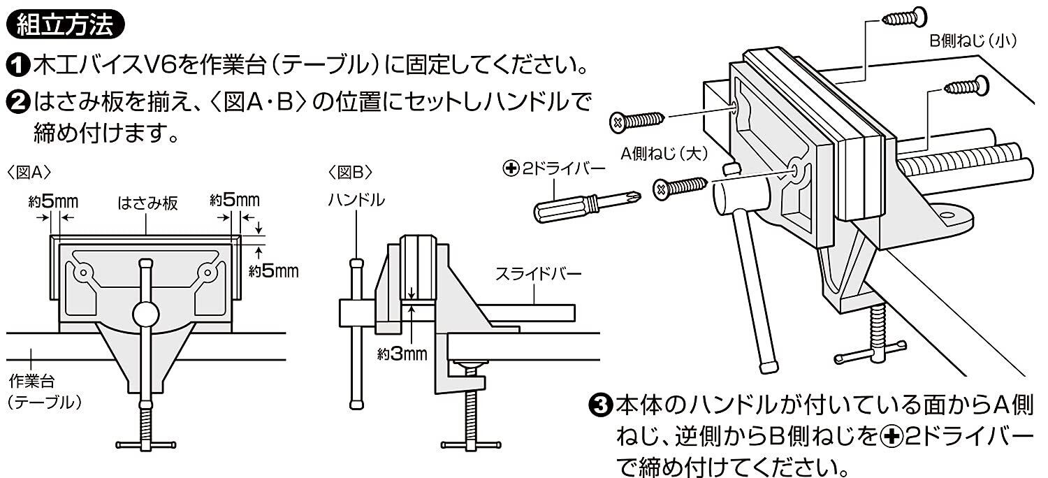 ・バイス口部分に保護用の板(はさみ板)が付いているため、材料に傷をつけない