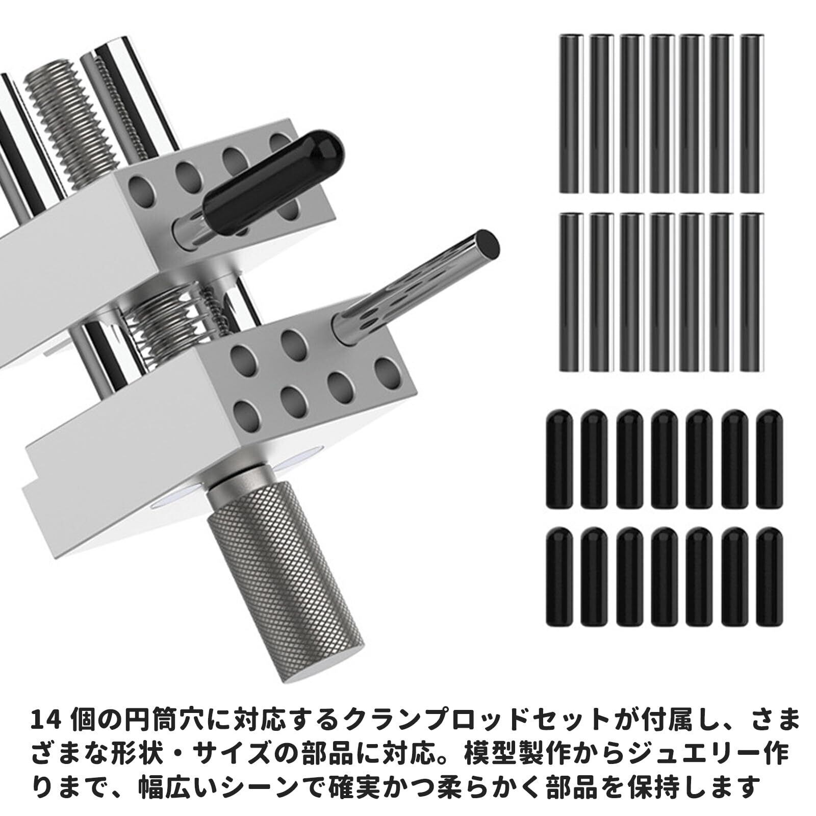 【多用途クランプシステム】14 個の円筒穴に対応するクランプロッドセットが付属し、さまざまな形状・サイズの部品に対応。模型製作からジュエリー作りまで、幅広いシーンで確実かつ柔らかく部品を保持します。