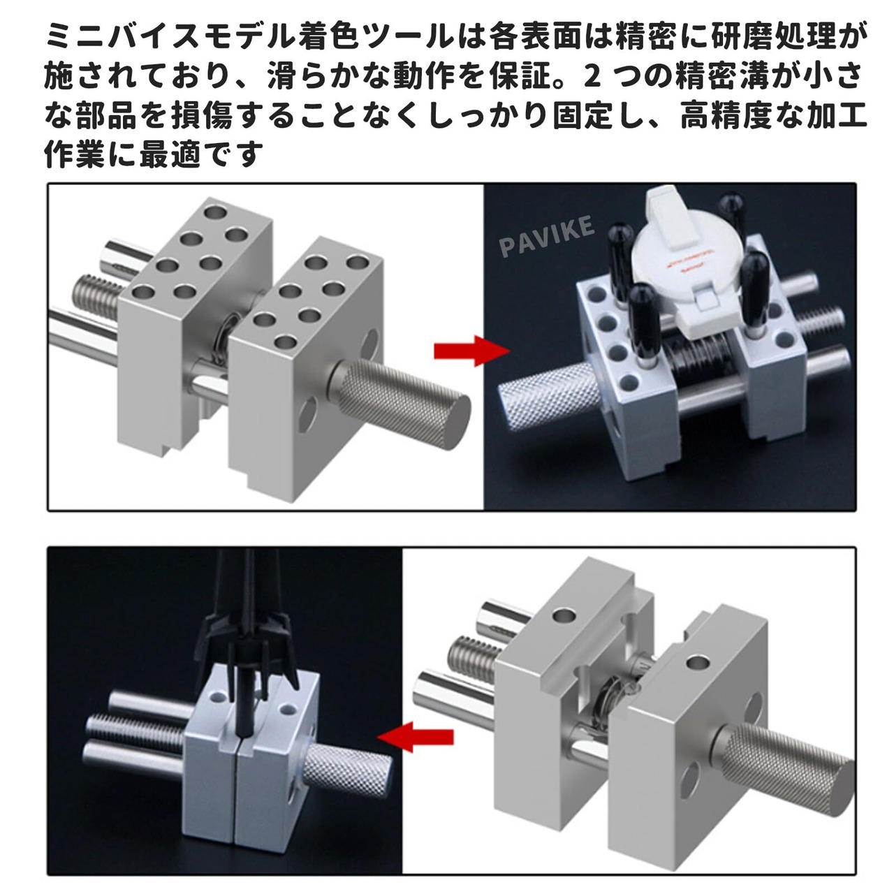 【精密研磨表面】ミニバイスモデル着色ツールは各表面は精密に研磨処理が施されており、滑らかな動作を。2 つの精密溝が小さな部品を損傷することなくしっかり固定し、高精度な加工作業に最適です。