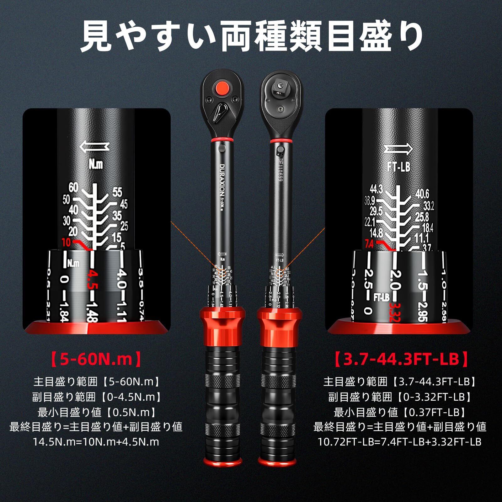 【見やすいダブル目盛り、照準しやすい目盛り線】2種類単位N.m / lbf-ft表示で選択肢を提供します,視認性も高いので、トルク値を簡単に読みます,炎天下でも見やすいトルクレンチです。目盛り数値はレーザー刻印で、長時間に使用しても、消えることがありません。目盛り線が粗化されました、より照準しやすい.最小目盛りは0.5N.mで、微調整できます。読み方の例:最終目盛り(9.5N.m)=主目盛り値(5N.m)+副目盛り値(4.5N.m),ちなみに、使わない時は目盛りをゼロに回してください,本商品は毎年または5000回使用した後に検証しなければなりません