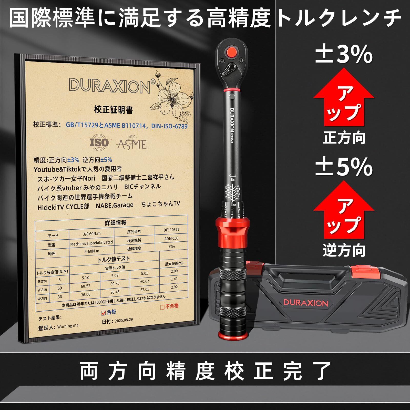 【ISO基準の測定精度、72歯と 5°送り角】このバイク用トルクレンチの両方向の精度も検証済です,正方向の測定精度は±3%でISO基準:精度は±4%以内でDIN-ISO-6789(国際標準)を満たします, GB/T15729とASME B1107.14に要求された精度標準にも満足しています,逆方向の測定精度±5%も工業級精度標準にも満足します。72歯と 5°送り角のデザインで狭い場所でも使える3/8インチトルクレンチです