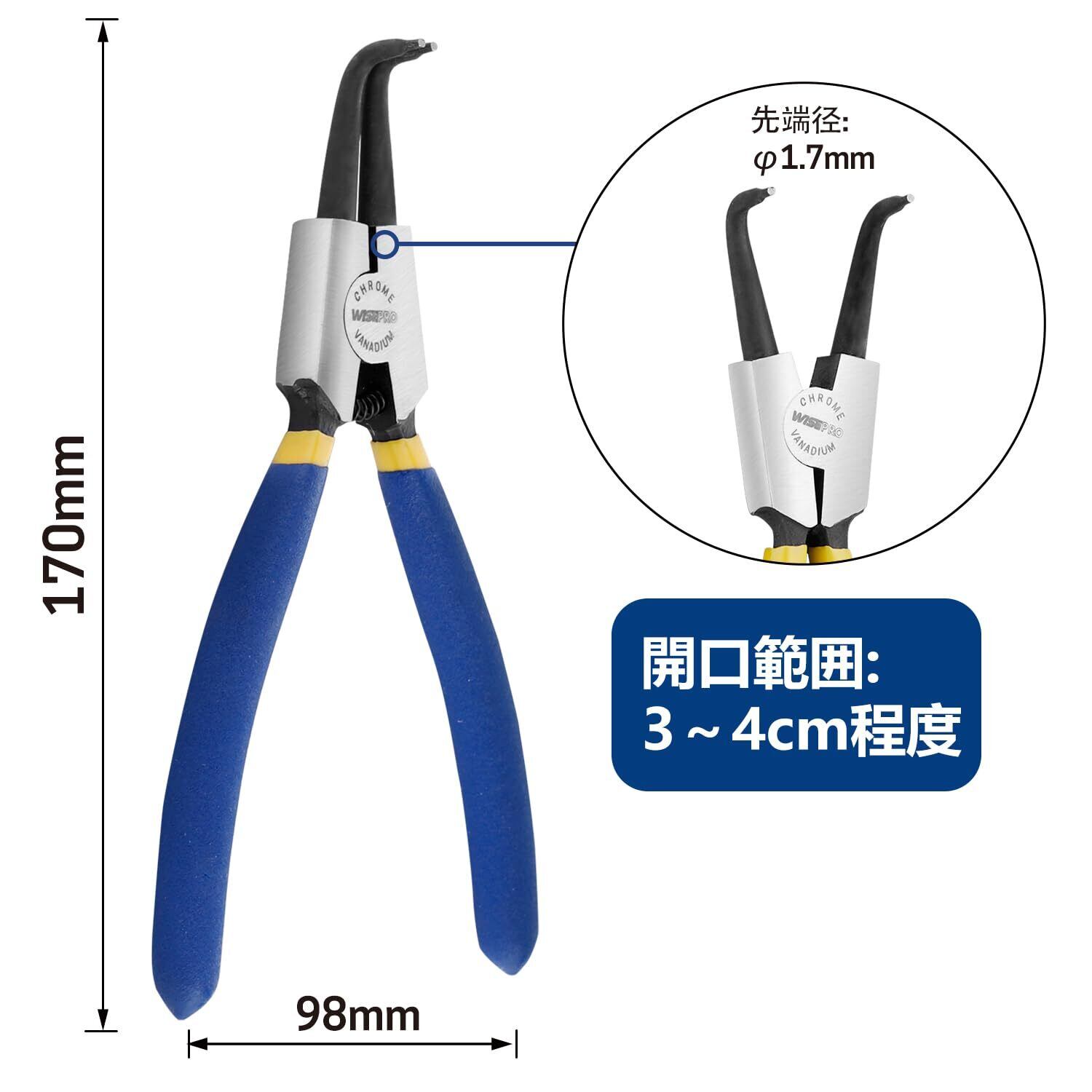 スナップリングプライヤー バネ付き 軸用 固定式 曲爪 Cr-V材質 C型リングの着脱 プライヤー 曲がった先端 先端直径φ1.7mm 工具 作業 修理 全長170mm(90°・軸用)