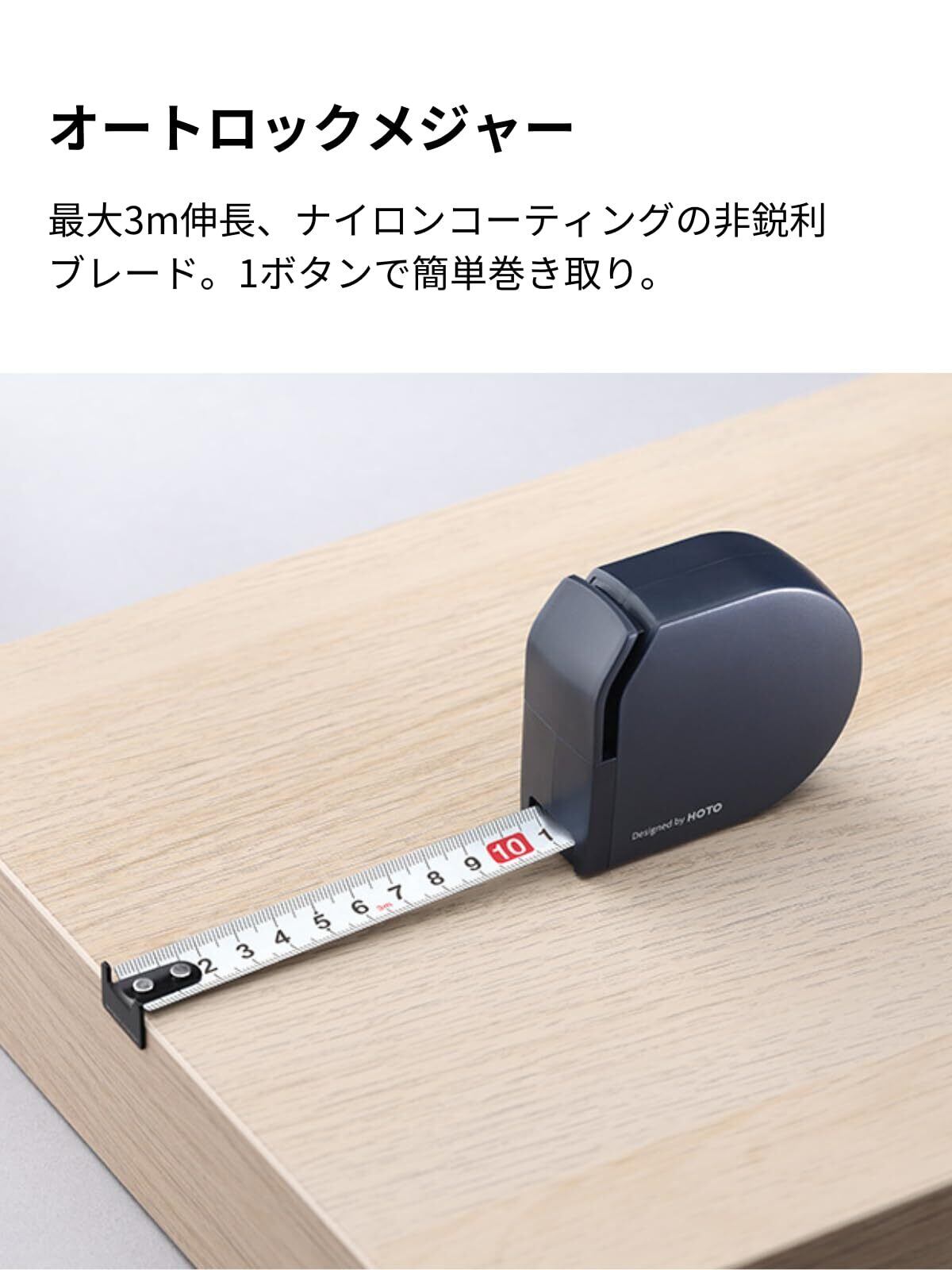 【 オートロックメジャー 】 最大伸長3mで、ナイロンコーティングされた非鋭利ブレードが採用されたオートロックメジャーです。1ボタン操作で簡単に巻き取りが可能です。