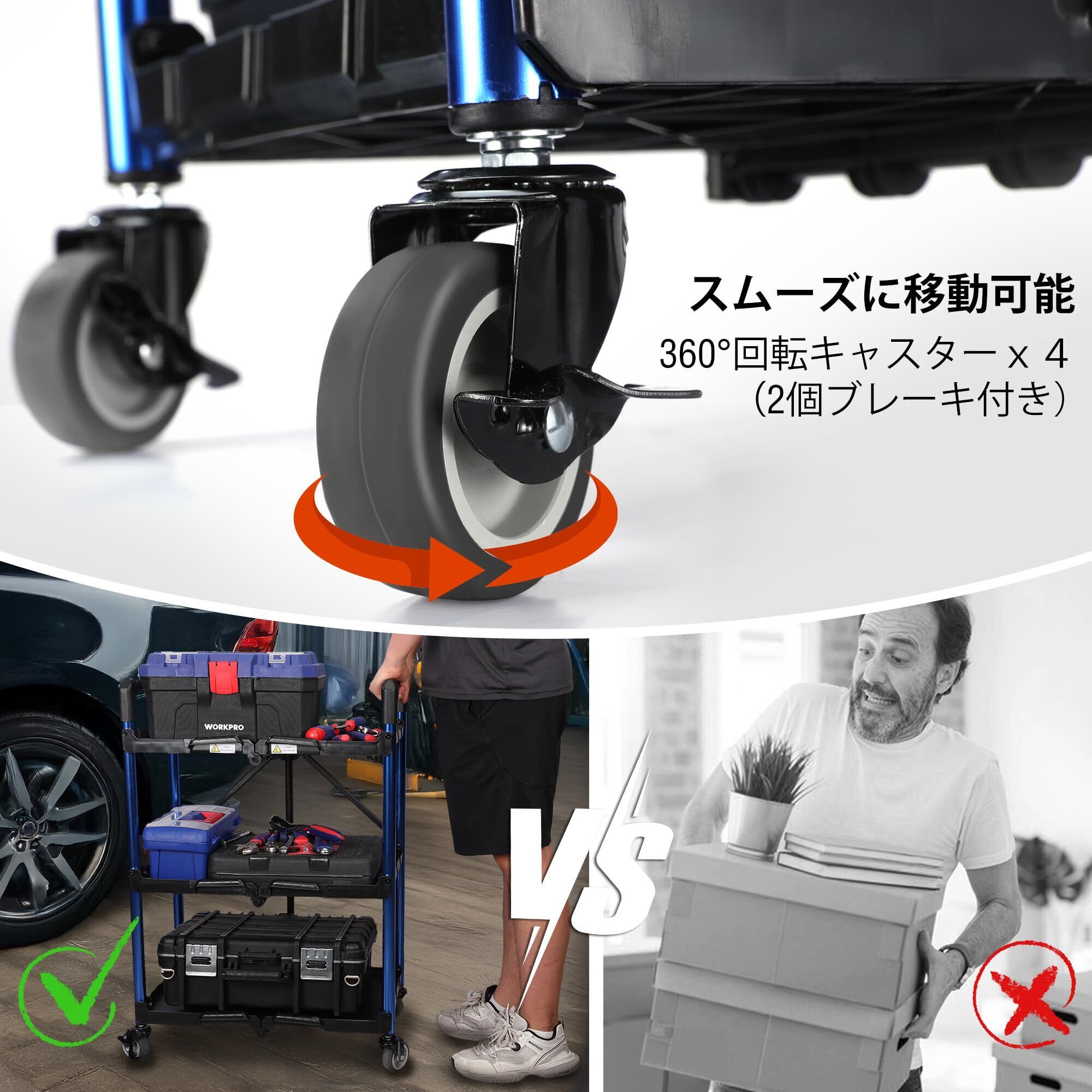WORKPRO ツールワゴン ツールカート 工具ワゴン 工具カート 折りたたみ 3段式 キャスター付き 合金鋼 総耐荷重95kg 工具収納 整備用 移動 運搬 作業