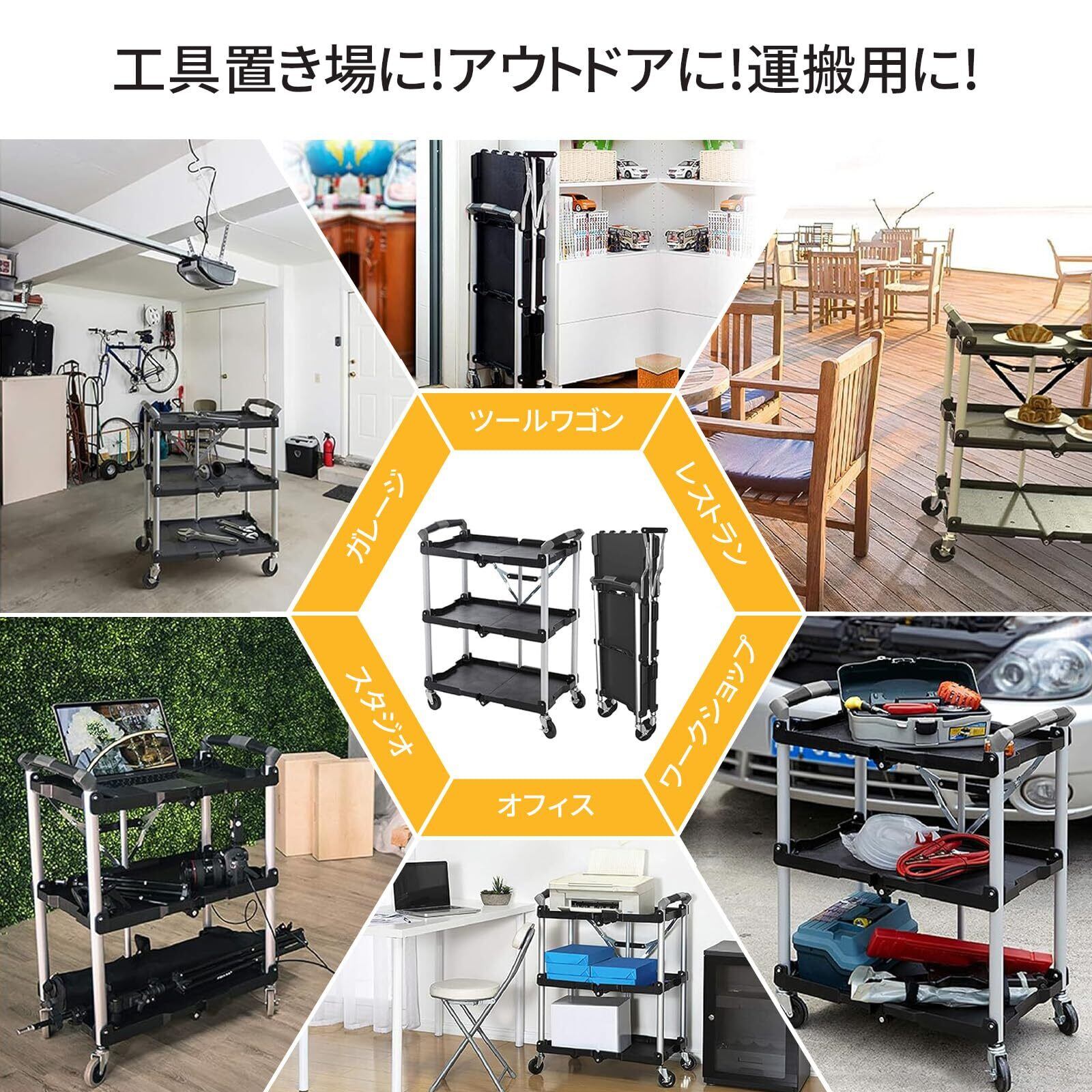 【折りたたみツールワゴン】作業現場で必要な工具や設備をすべて 1 台でまとめて運びましょう!3 段の広い棚板には、ドライバーセット、ハンマー、ケーブルなどの大型道具も余裕で収納可能。安全ロック機構が強力なブレーキのように作動し、激しい振動や傾斜でも不用意な折りたたみを防ぎます。90KGの積載容量で、重い機械部品の移動も簡単にサポートします。