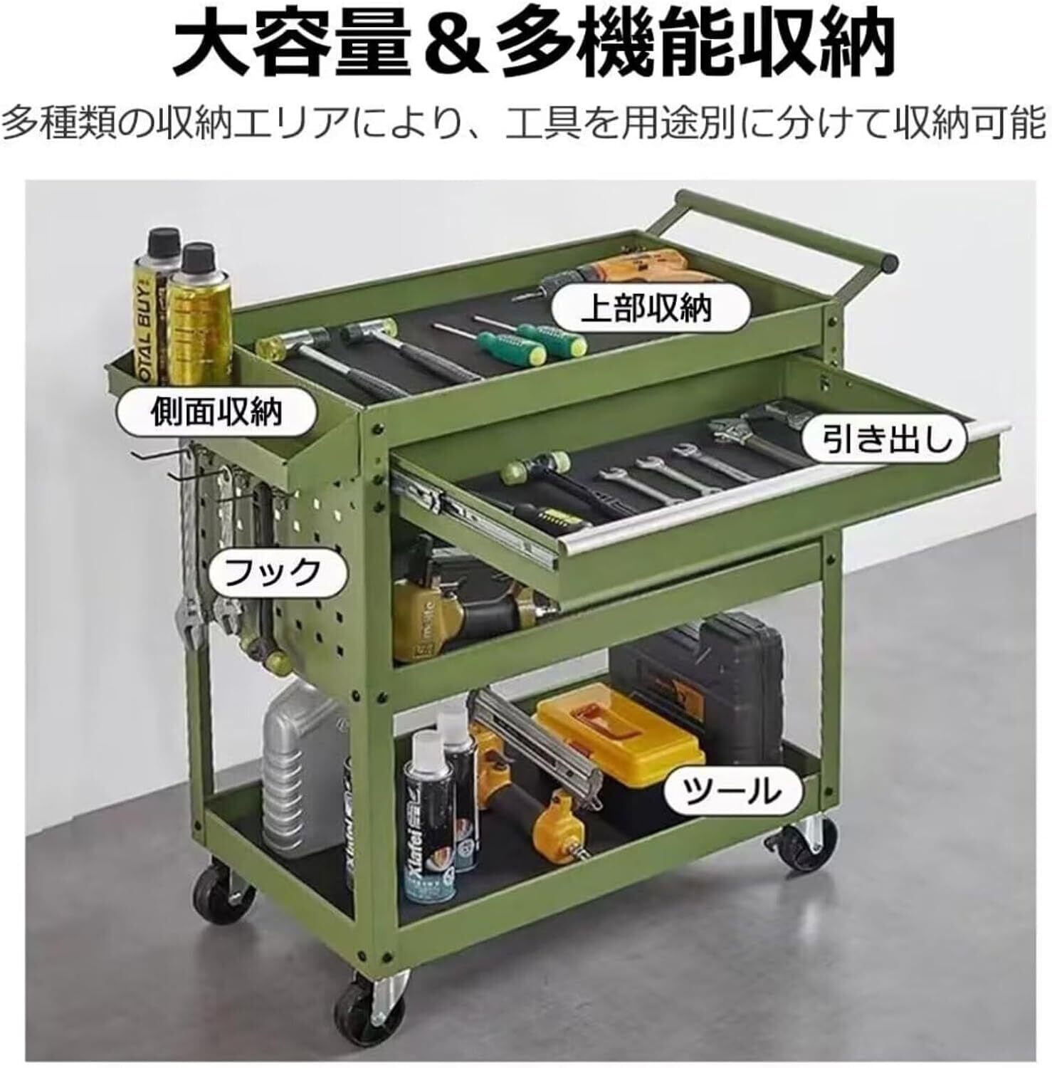 「便利な3段構造&大容量収納」3段仕様の工具ワゴンは、工具や部品を種類ごとに整理でき、効率的に収納。視認性も高く、必要なアイテムが一目で分かります。
