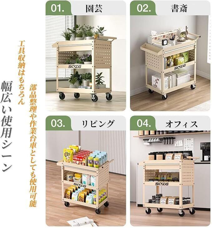 「多用途対応&幅広い使用シーン」工具収納はもちろん、部品整理や作業台車としても使用可能。工場・ガレージ・倉庫など様々な現場で、プロからDIYユーザーまで幅広く対応するツールカートです。