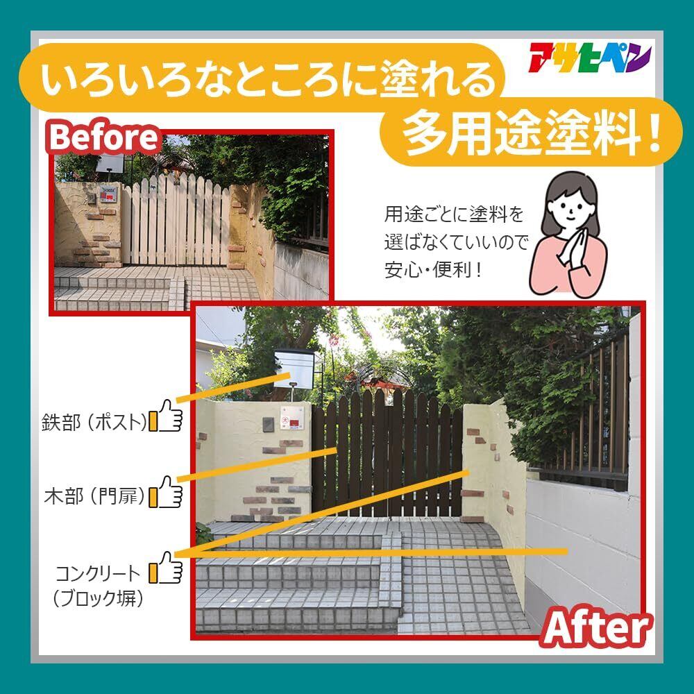 用途:(屋内外区分:屋内外用)ドア、雨戸、羽目板、板べい・ガーデン用品など屋内外の木部や家具・木工品などの木製品。浴室・居間・台所などのしっくい・モルタル・コンクリート壁・板壁。コンクリート・ブロック・スレート・各種サイディングなどの外壁やへい。フェンス・門扉・鉄柵・看板・おもちゃなどの鉄部・鉄製品。発泡スチロール・アクリル・硬質塩ビなどのプラスチック面。