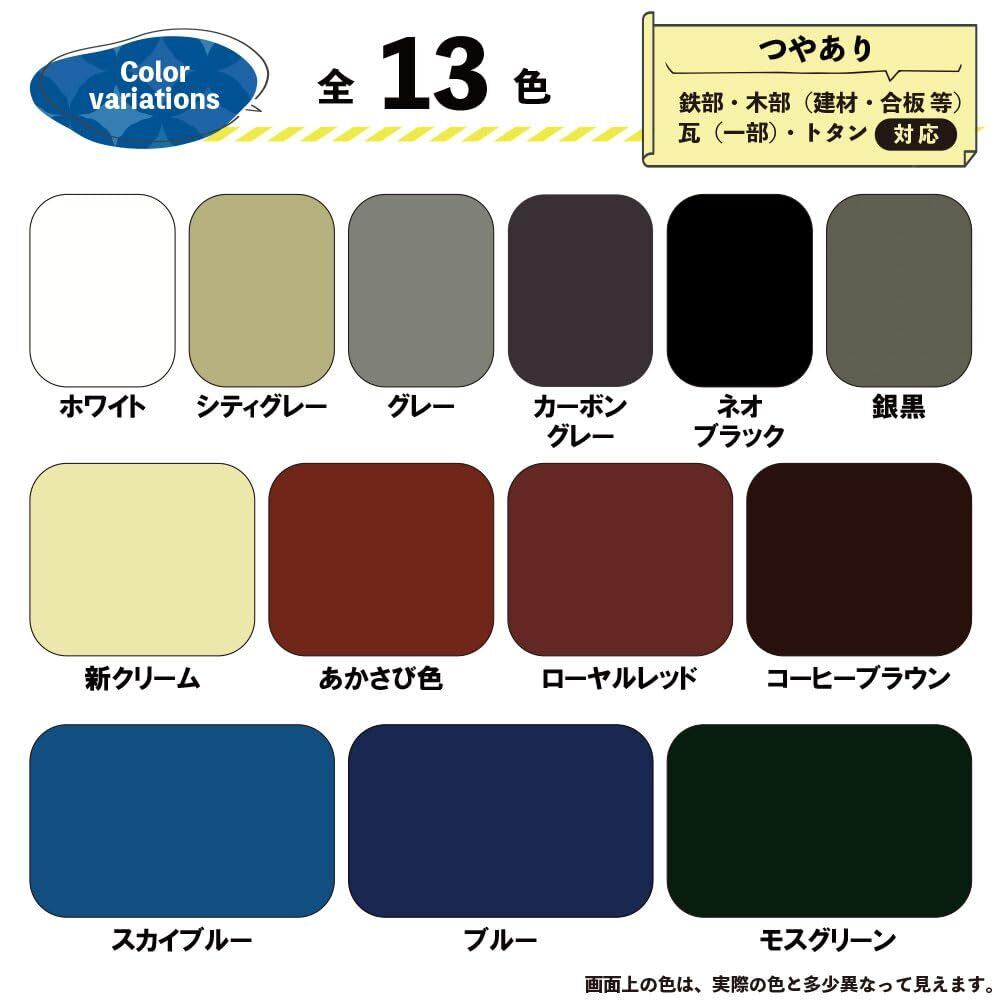 【特徴】■[遮熱効果がある塗料]遮熱顔料(特殊遮熱顔料・赤外線反射顔料)+アクリルシリコン樹脂(酸性雨・塩害・紫外線・排気ガスなどに強い塗膜を形成)の効果により超高性能塗膜がWブロック効果。※銀黒は赤外線反射顔料を配合しておりません。 ■[最大18℃~4℃抑えます]赤外線反射顔料が赤外線を反射し、屋根の表面温度上層を最大18℃~4℃抑えます。(当社従来塗料比較) ■[屋外特有のダメージからガード! ]アクリル・シリコン樹脂配合により酸性雨、塩害、紫外線、排気ガスなどの汚れに強い塗膜を作り、建物の外観を美しく保ちます。 ■[熱による劣化からガード! ]遮熱効果により従来の塗料に比べ熱による劣化を防ぎます。 ■[優れた耐水性]耐水性に優れ、お住まいの屋根を雨水から守ります。 ■[使いやすいペンキ]速乾で、臭いが少なく、安全で環境にやさしい水性塗料です。 ■[カビからガード! ]強力防カビ剤配合で、長期間カビの発生を防ぎます。 ■[作業性が良い]速乾性の為、時短作業や作業工程の短縮にも。 ■[さらに遮熱効果を高めるには]別売りの水性シリコン遮熱屋根用を下塗りにご使用頂くと、さらに遮熱効果を高められます。 【用途】■用途以外には使用しないで下さい。 ■[屋根]セメント瓦 / スレート瓦 / トタン / 新生瓦(カラーベスト・コロニアルなど)※新しいトタンは塗料の付着が悪いので、半年位放置後、表面のギラギラがなくなってから下記いずれかの下塗りを施してから上塗りをして下さい。 1.品「さび止めシリーズ(水性または油性)」 : 効果 / さび止め。 2.品「水性シリコン遮熱屋根用専用下塗り剤」 : 効果 / さび止め & 遮熱効果が大幅にUP。 ※瓦に塗装する場合は、専用下塗り剤を使用する前に、の『油性密着シーラー』をご利用ください。(新築・新品の瓦は除きます。) ■[木部・鉄部]建材/ 合板 など。 【塗れないもの】 ■[瓦]釉薬瓦 / 無釉薬粘土系瓦 / 施釉セメント瓦 / 施釉コンクリート瓦 / 乾式洋瓦(モニエル瓦) / シングル系瓦 / 天然石瓦 ■[板材]ガルバリウム鋼板 / 塩ビ鋼板 / フッ素鋼板 / 銅板、ステンレス板 / アルミ板 / 樹脂板 ※材質の種類を確認してからご使用ください。 【乾燥・塗り重ね時間】 【20℃】乾燥時間:約 1 時間 塗重時間約 4 時間 【冬期】乾燥時間:約 2 時間 塗重時間:約 6 時間 【塗り面積(2回塗り)】 [0.7L]平方メートル:約 2.5 ~ 3.5m² タタミの広さ:約 1.8 枚分 [1.6L]平方メートル:約 5 ~ 8m² タタミの広さ:約 4 枚分 [3L]平方メートル:約10 ~ 15 m² タタミの広さ:約 8 枚分 [7kg]平方メートル:約 22~ 32 m² タタミの広さ:約 16 枚分 [14kg]平方メートル:約 45~ 64 m² タタミの広さ:約 33 枚分 【塗装時の注意】 ■[ひび割れ、穴、目地などがある場合]コーキング材、速乾セメントなどで埋め、できるだけ平らにしておきます。※塗料の塗れないコーキング材もあるので要注意 ■[瓦の隙間のコーキング]瓦の重なり部分や突き合わせ部分の隙間は、コーキング材や塗料で埋めないようにしてください。※水はけが悪くなり雨漏りの原因となります。 ■[吸い込みのある面]吸い込みのある面はつやが出にくくなることがあります。乾燥後更に塗り重ねてください。 ■[色味が違って見える色は]塗装後の色が色見本と異なって見える色(ネオブラック等)がありますが、乾燥すると見本と同じ色味になります。 ■[油性密着シーラーを使う時の注意点]油性密着シーラーがコーキング材を侵す場合があり、上塗り塗料が上手く塗れない場合があります。 油性密着シーラーを塗装後にコーキング材を使用してください。 ■[熱い瓦に塗る時は]夏場はできるだけ早朝から作業し、直射日光で屋根の表面が熱くなる前に塗装してください。瓦が熱くなり泡が吹き易くなります。熱い瓦に塗る時は、水で更に5%前後うすめて塗ります。 ■[表面が塗れている場合は塗らないで]塗装面が濡れていたり湿っていると乾燥が遅れ、塗膜異常の原因になります。雨上がりや水洗いしたときは1日以上乾燥させてから塗ってください。 【うすめ液・用具の洗浄】 水 (塗りにくくなった時だけ5%以内で薄めます)