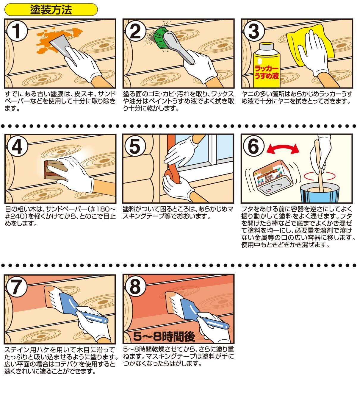 下処理方法:■塗る面の汚れやワックスを取り除き、油分はペイントうすめ液でふき取ります。■ヤニの多い箇所はあらかじめラッカーうすめ液で充分にヤニを取り除きます。■目の粗い木は、サンドペーパー(#180~240)を軽くかけてから、とのこで目止めをします。