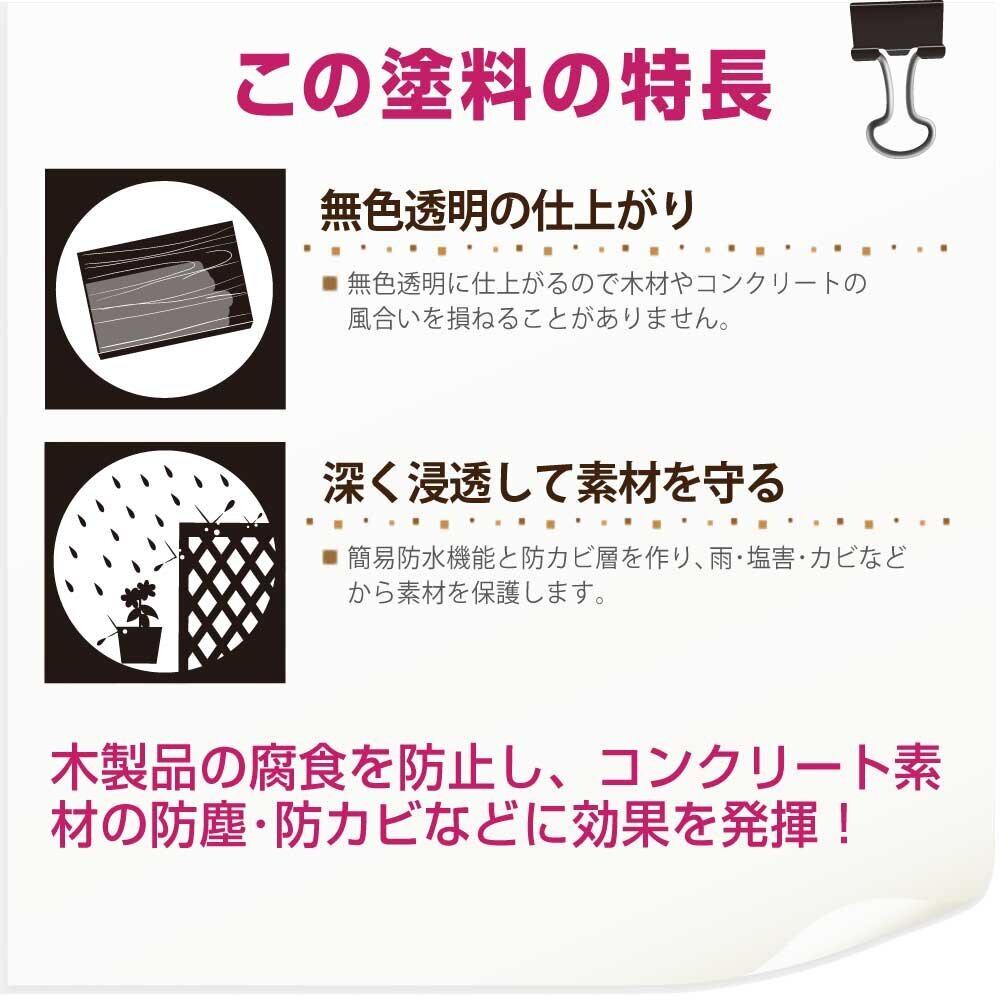 【特長】■[防水材 素材を保護]素材の内部に深く浸透して簡易防水層、防カビ層を作ります。 ■[無色透明の仕上り]無色透明に仕上がるので木材やコンクリートの素材や風合いを損ないません。