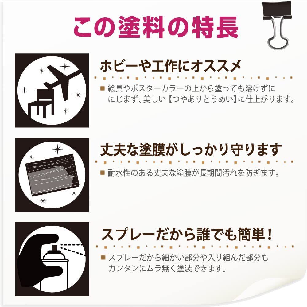 【特長】 ■[イラストの仕上げ剤に]絵の具やポスターカラーの上から塗っても溶かさず、にじまず、美しいつやありとうめいに仕上がります。 ■[汚れからガード]耐水性のある丈夫な塗膜をつくり、長期間汚れを防ぎます。 ■[建築基準法対応塗料F](スプレーを除く)安心・安全の環境にも配慮したFの製品です。 ■[滑らかな仕上り](スプレーのみ)刷毛跡が付かず、滑らかに仕上がります。【用途】 ■[ホビー・工作]紙ねんど細工 / ペーパークラフト / 工作品 ■屋内の木部・木製品 【塗れないもの・注意事項】表示の用途以外には使用しないでください。 ■[吸い込まない素材]プリント合板 / デコラ板 / ツルツルした紙・ポスター など ■[特殊な塗装面]UV塗装 / セラミック塗装 など ■[常に水がかかる所]浴室 など ■[その他]高級家具 / 床面 / テーブル天面 / 本棚など【乾燥・塗重時間】■スプレー 【20℃】乾燥時間:約 10 分 塗重時間:約 30 分以上 【冬期】乾燥時間:約 30 分 塗重時間:約 1 時間以上 【塗り面積(2回塗り)】 スプレー300ML平方メートル:約 0.5 ~ 0.8 m² タタミの広さ:約 0.4 枚分【塗装時の注意】 ■[状況によって異なります]乾燥時間、塗り面積の表示は気象条件、塗る素材、形状、塗り方、色、うすめ方などによって多少異なります。 ■[試塗をしてください]絵の具やポスターカラーはメーカーや色によって、多少にじみが出ることがありますので(特に赤系の色など)、試し塗りしてください。 ■[熱にご注意]塗装後、上に熱い物をのせたり、熱湯がこぼれると白くなることがあります。 ■[薄める際は]つやだしニスうすめ液以外でうすめないでください。【うすめ液・用具の洗浄】 つやだしニスうすめ液 (塗りにくい時は5%以内でうすめてください。)