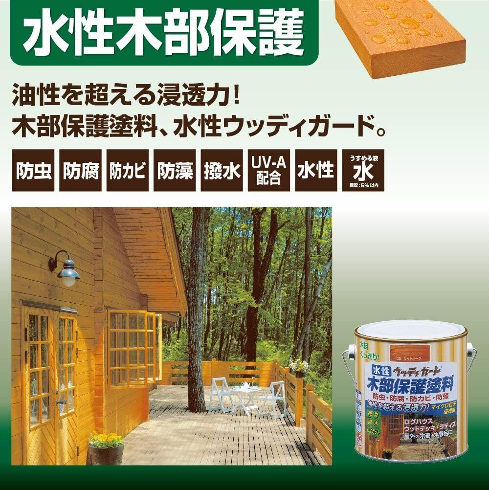 マイクロ粒子浸透型の新しい微臭の水性木部保護塗料です。 木材の防虫・防腐・防かび・防藻効果に優れ、木材に浸透して内部から木の腐食を防ぎます。 耐候性に優れたマイクロ粒子浸透型顔料の採用で、木目がよりくっきりキレイな仕上がりになります。 日光による木の焼けを防ぐために、紫外線吸収剤を配合し色アセ・劣化を防止します。(UVカット) 自然にやさしい蜜蝋成分を配合し、はっ水効果があります。