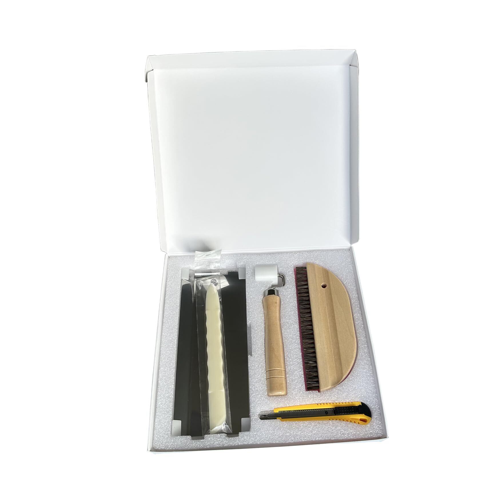 完璧な壁紙施工セット: 壁紙はがし、糊付け、カッター、ブラシなど、壁紙張り替えに必要な道具が全て揃っています。