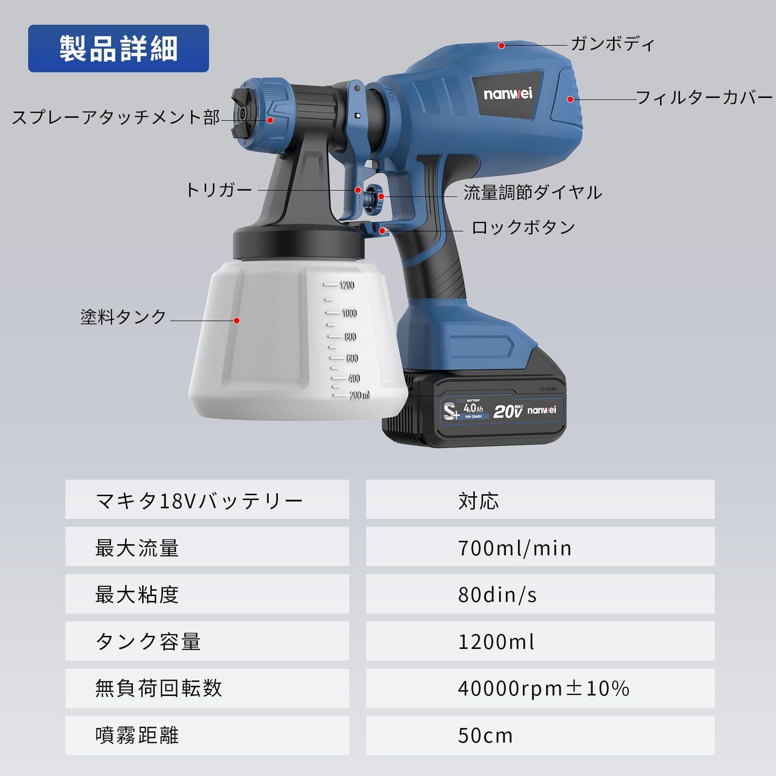 【2025新型】NANWEI コードレススプレーガン マキタ18Vバッテリー対応 電動スプレーガン 充電式塗装ガン 1200ml大容量塗装機 水性油性塗料対応 噴射量調節可能 三つの吹き付けパターン 4種類のノズル (本体のみ)