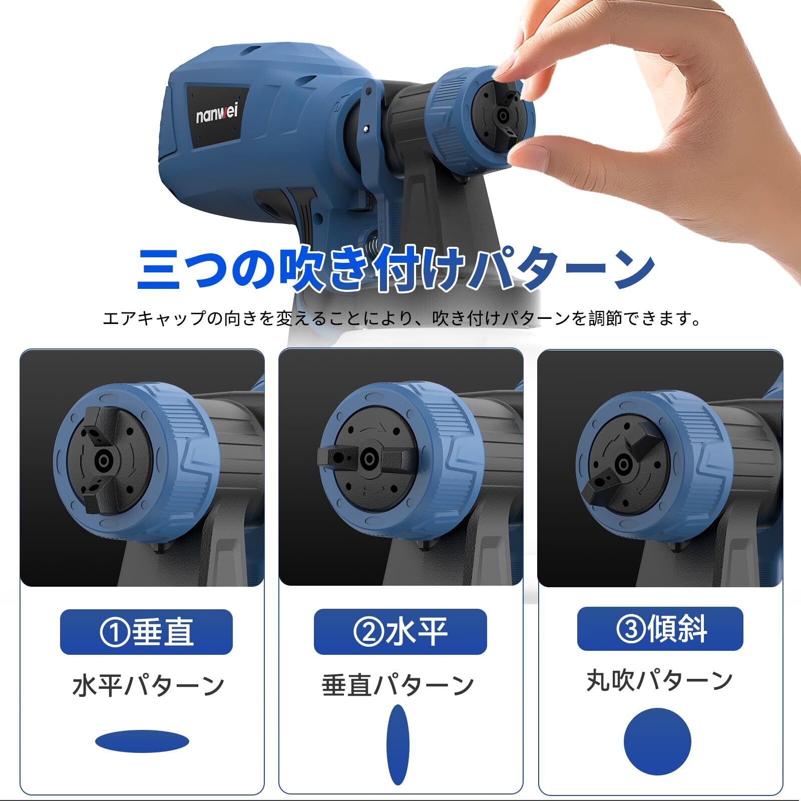 【三つの吹き付けパター】充電式塗装ガンのエアキャップの向きを変えることにより、吹き付けパターンを調節できます。水平パターン、垂直パターン、丸吹パターンの三つ噴霧形状を実現したコードレススプレーガンは、作業シーンに応じてさまざまな塗装プロジェクトに適しています。