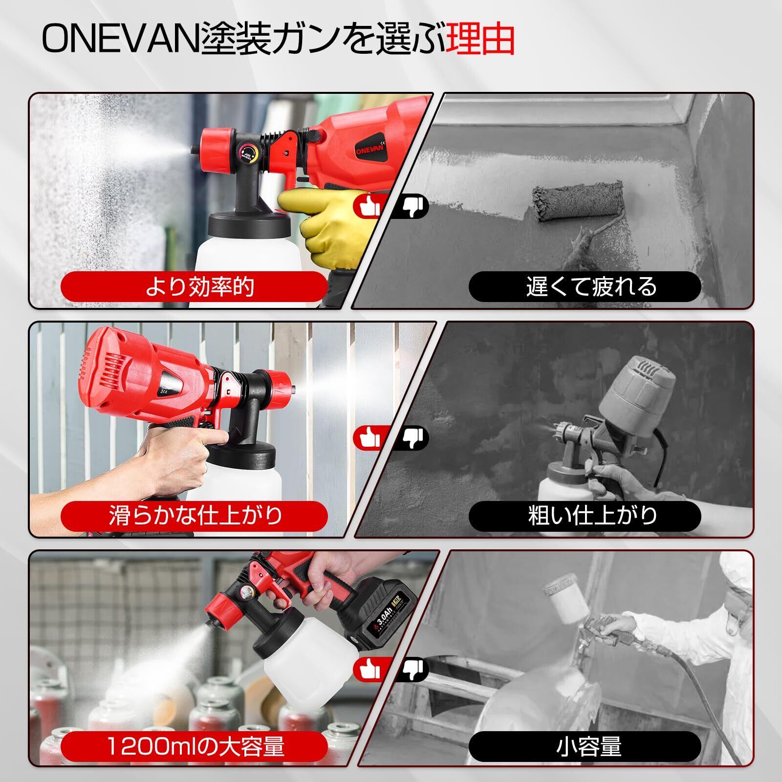ONEVANコードレススプレーガン 21V電動スプレーガン 充電式塗装ガン 塗装ガン 1200ml大容量塗装機 水性油性塗料対応 噴射量調節可能 三つの吹き付けパターン 4種類のノズル (本体&バッテリーX2)