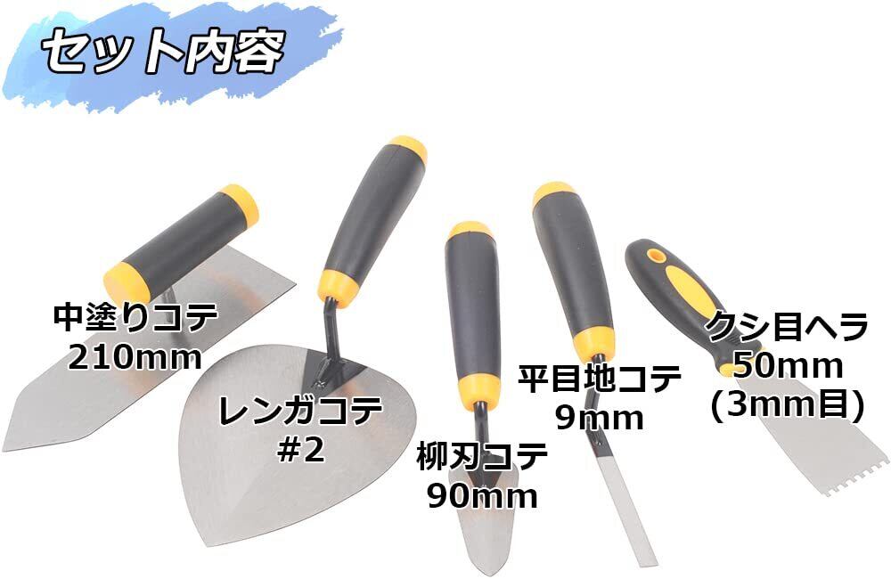 セット内容:中塗りコテ210mm・レンガコテ2番・柳刃コテ90mm・平目地コテ9mm・クシ目ヘラ50mm(3mm目)