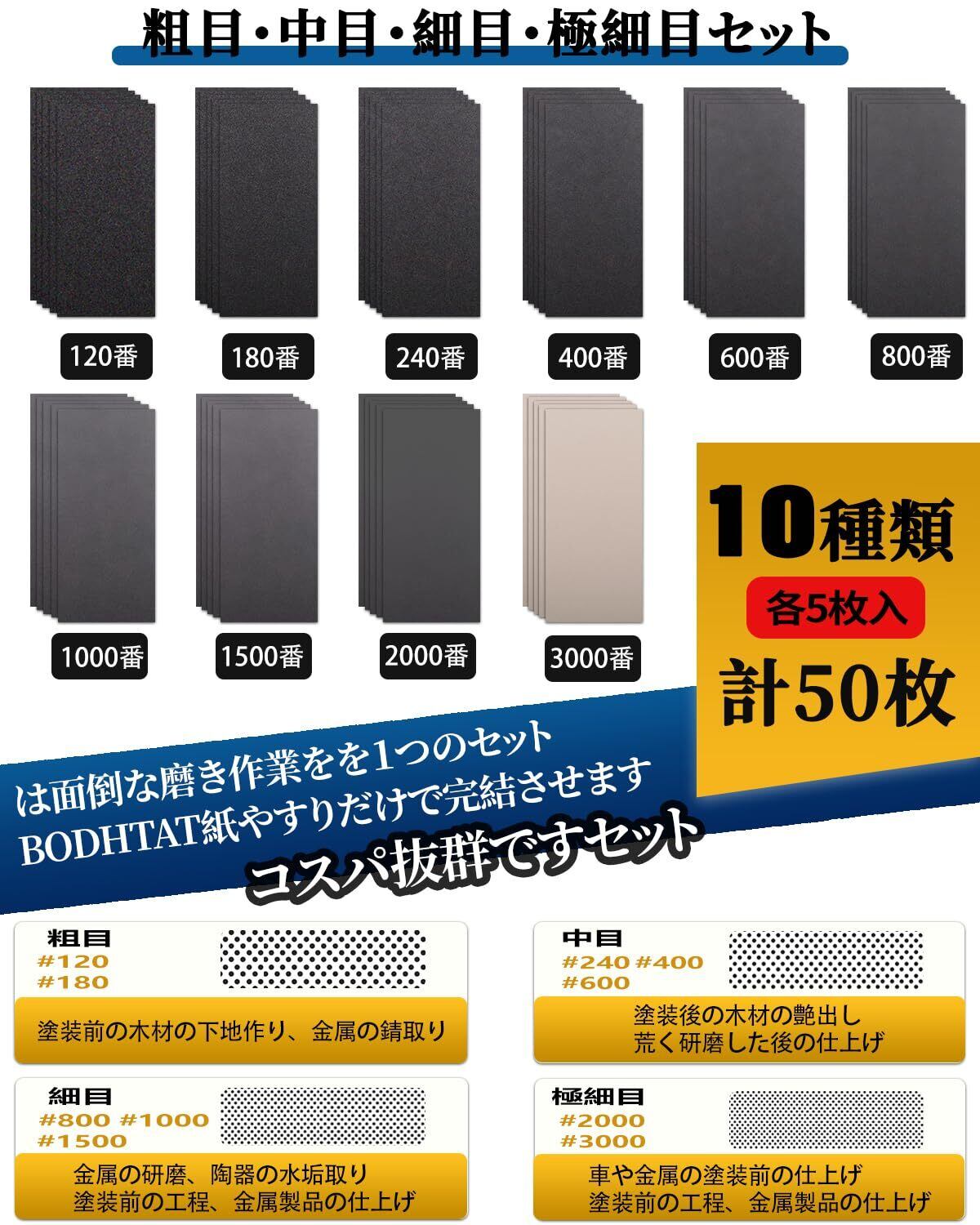 紙やすり 耐水ペーパー セット 50枚入10種類 #120~3000番 230×93mm サンドペーパー (120/180/240/400 600/800/1000/1500/2000/3000 各5枚) 紙ヤスリ 耐水ヤスリ,車 金属磨き 木工DIY作業に キッチンの掃に最適です